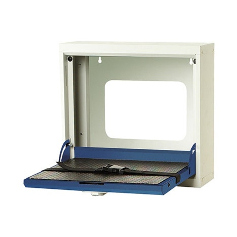 verso wall mounted laptop holder. Featuring a robust, fully welded steel housing with a lockable door which doubles as a laptop shelf. With inner mat and fixing strap. Finished in durable powder coat paint in RAL 7035 light grey / RAL 5010 gentian blue. WxDxH: 500x150x410mm.