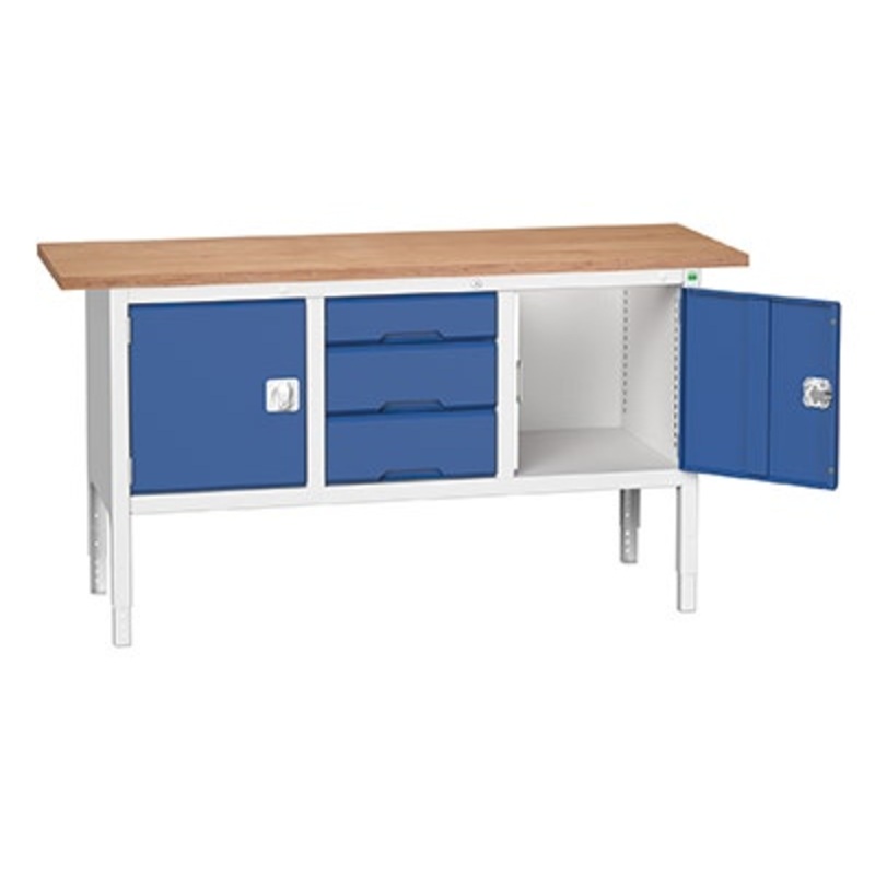 verso height adjustable storage bench 1750X600x830-930mm with 30mm Mpx worktop. Light grey / blue (RAL 7035 / 5010) powder coated finish. Complete with 2 x 350mm high cupboards. Supplied with 1 x 125mm , 2 x 175mm lockable drawers Brand:Bott