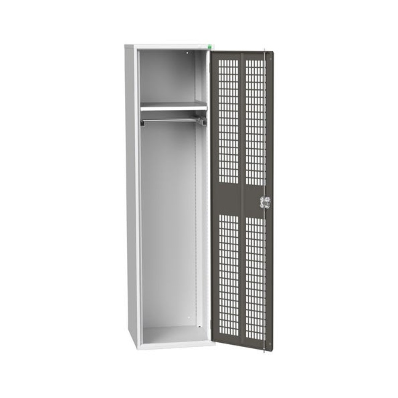 verso ventilated door PPE / janitorial kitted cupboard. Featuring a robust, fully welded steel housing and single, Ventilated door with 1 adjustable height, galvanised steel shelf (75kg U.D.L.) and a hanging rail. Finished in durable powder coat paint in RAL 7035 light grey / RAL 7016 anthracite grey. WxDxH: 525x550x2000mm.