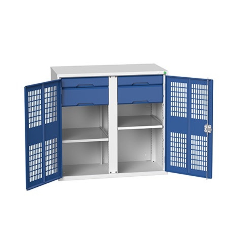 verso ventilated door kitted cupboard with vertical partition. Featuring a robust, fully welded steel housing with a central vertical partition and double, Ventilated doors with 2 adjustable height, galvanised steel shelves (75kg U.D.L.) and 2x 100mm, 2x 175mm drawers with 100% extension slides (75kg U.D.L.). Finished in durable powder coat paint in RAL 7035 light grey / RAL 5010 gentian blue. WxDxH: 1050x550x1000mm.