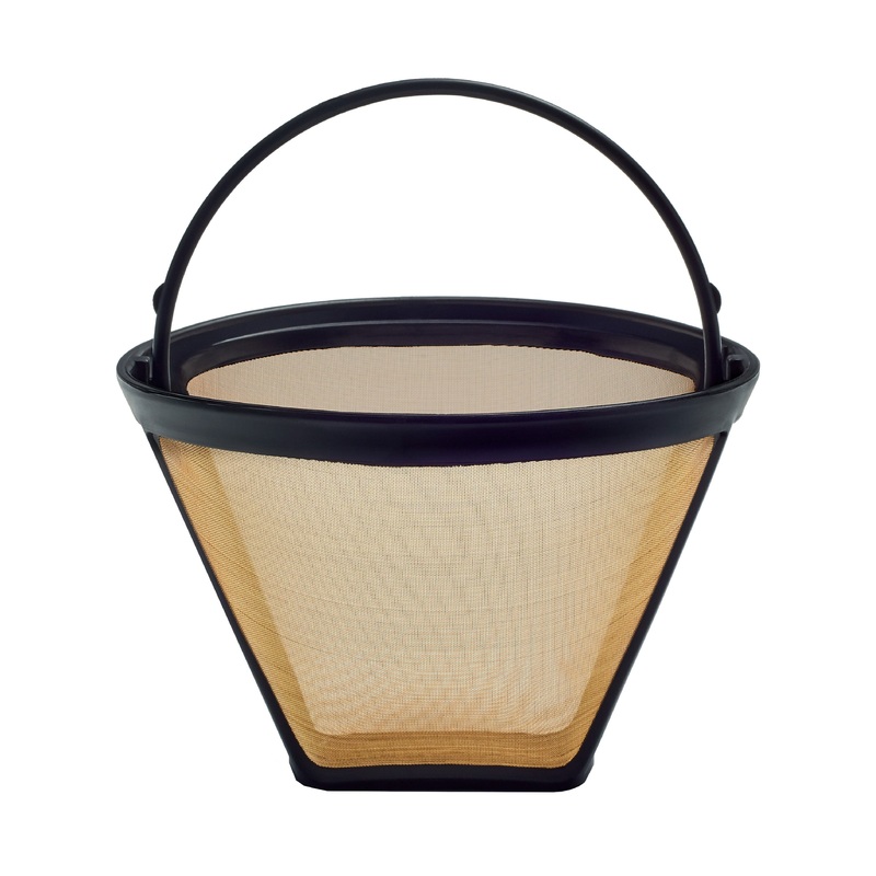 The Braun GoldTone Filter BRSC002 by DeLonghi, fits size 4 cone filters for 10-12 cup coffee makers. This long-lasting and reusable filter is dishwasher-safe and eliminates the need for messy paper filters, making cleanup a breeze. A handle for easy lifting is also included.