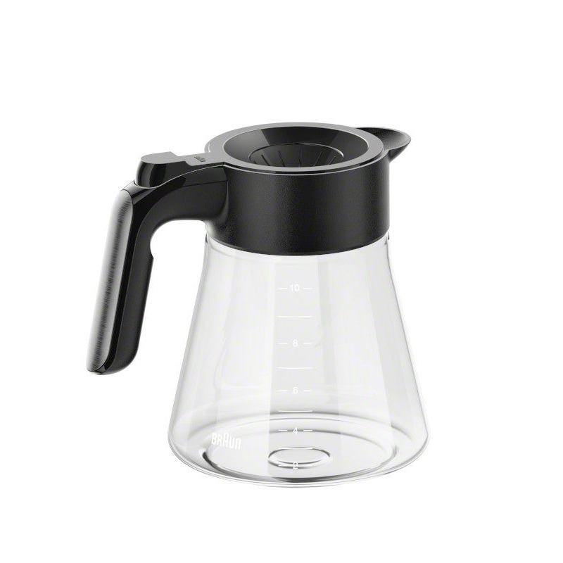 OverviewThis 10-Cup Replacement Glass Carafe for the Braun MultiServe series of coffee makers is an OEM replacement part that is manufactured by Braun. Featuring a black plastic handle, top rim and spout, this glass carafe is labeled with 2 - 10 cup markin