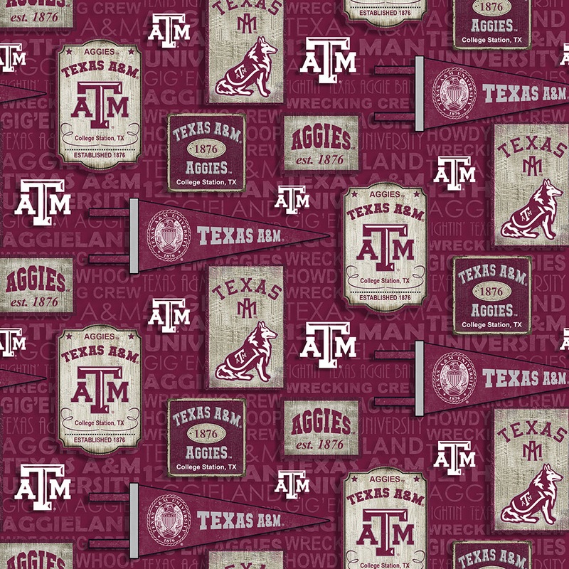 College Cotton for Sykel EnterprisesColor: Texas A&M Vintage Pennant | TAM-126744"-45" Width100% CottonAll sales finalAll Fabric is sold in 1/4 yard increments.