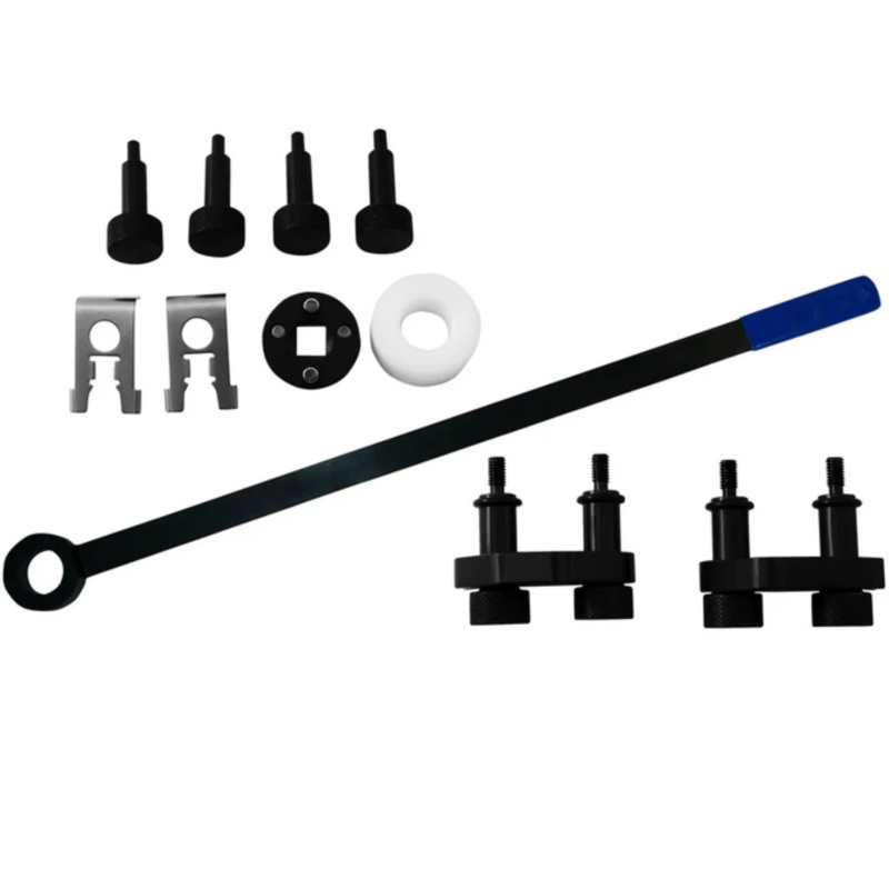 - Includes crank counter hold tool, crankshaft thrust piece, (4) drift for camshaft slide pieces, (2) locking clips, (2) camshaft clips, (1) assembly tool