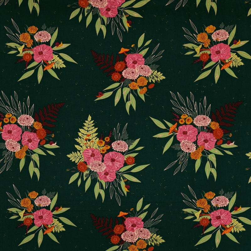 Moon Forest Echoes captures the quiet magic of a twilight garden, with lush floral bouquets blooming in each corner against a deep forest green sky. Bright coral, goldenrod, and blush flowers are surrounded by feathery greenery, while tiny stars and hidden forest creatures add a layer of quiet whimsy. This layout-style print is ideal for fussy cutting, centerpiece panels, quilt backs, or creating artful wall hangings. Its painterly composition and balanced design make it perfect for storytelling projects or for anyone who wants to sew with a touch of enchanted mystery.