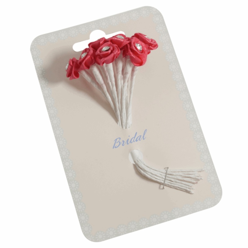 These beautiful dark coral ribbon roses with diamante centres are ideal to decorate favours, wedding accessories and more. The flowers can be separated by cutting the twine and the stem length can be shorted by snipping the stem to the required lengthPack