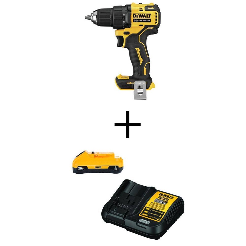 DEWALT DCD708BW230C ATOMIC 20V MAX Cordless Brushless Compact 1/2 in. Drill/Driver, 3.0Ah Battery, and 12V to 20V ChargerThe DCD708B 20-Volt MAX Compact Brushless Drill/Driver is the most compact DEWALT Drill in the 20-Volt MAX Platform at 6.3 in. front to back. The drill features a high performance brushless motor that delivers 340 Unit Watts Outs (UWO) and LED light to provide optimum illumination in dark spaces as you work. for increased comfort, the handle features an ergonomic design for balance and easier tool control along with a removable belt hook. Backed by a DEWALT 3-year limited warranty so you can buy with confidence. The DCB230C includes a 3.0 Amp Hour Lithium-Ion battery pack and charger.Compact at only 6.3 in. front to back designed to fit in tight spacesLightweight at only 2.4 lbs.LED foot light for superior visibilityVariable speed trigger allows for control and precision on delicate work surfacesDEWALT built brushless motor for efficient performance and runtime1/2 in. ratcheting chuck provides superior bit gripping strength340 UWO of power to help get the job doneDCB230C same runtime and power in a lighter, shorter package compared to DCB200DCB230C 33% more runtime than DC9096 18-Volt batteryDCB230C 22% lighter (1.06 lbs.) than DCB200DCB230C no memory and virtually no self-discharge for maximum productivity and less downtimeDCB230C 3 LED fuel gauge to quickly check state of charger on batteryDCB230C part of the 20-Volt max systemDCB230C 3.0 Amp hour capacityDCB230C diagnostics with LED indicator for battery charge status of charged, charging, power line problem, replace pack or battery temperature problemDCB230C charges DEWALT 12-Volt to 20-Volt max lithium-ion batteriesDimensionsProduct Depth (in.)9.187 inProduct Height (in.)3.25 inProduct Width (in.)6.75 in