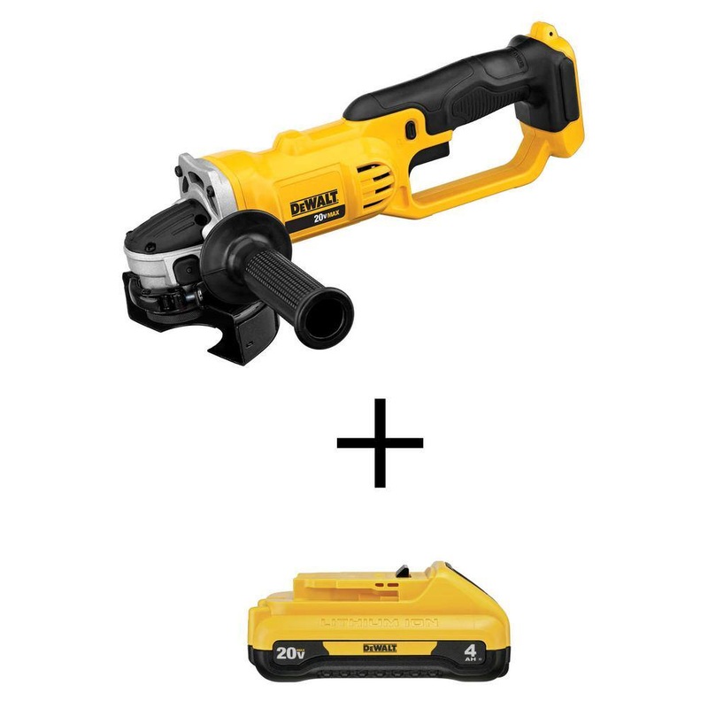 DEWALT DCG412BW240 20V MAX Cordless 4.5 in. 5 in. Grinder and (1) 20V MAX Compact Lithium-Ion 4.0Ah BatteryThe DEWALT 20-Volt Max Lithium-Ion 4-1/2 in. Cut Off Tool (model DCG412B, tool-only) is ideal for a wide range of construction, maintenance, repair and automotive applications. This versatile tool is designed for electricians, mechanical contractors, ironworkers and automotive mechanics tasked with cutting, grinding and finishing metallic materials. It delivers 8000 RPM for fast cutting and grinding applications and features a quick-change wheel release that enables wrench-free wheel changes. Additionally, the device offers a tool-free adjustable guard that allows safe and quick repositioning of the guard without the need for a tool or key. A 2-position side handle offers increased control and comfort. The DCB240 20-Volt MAX 4 Ah compact lithium-ion battery provides the highest capacity within the DEWALT 20-Volt MAX compact battery lineup.8000 RPM motor provides significant power for cutting and grinding applicationsQuick-change wheel release allows for tool-free wheel changes without the need for a wrenchTool-free guard allows for quick, easy guard adjustments/positioningIncludes 5 in. x 1/4 in. T27 metal grinding wheelIdeal for electricians, mechanical contractors, ironworkers and automotive mechanicsBatteries and chargers sold separately, works with these batteries (DCB200, DCB201) and chargers (DCB101, DCB119, DCB103)Backed by a 3-year limited warranty, 1-year free service contract and 90-day money-back guaranteeDCB240 4 Amp hour (80-Watt hour) capacity provides extended runtimeDCB240 compatible with 20-Volt MAX tools and chargersDCB240 includes fuel gauge 3 LED charge indicatorDCB240 lighter weight with same capacity as DCB204 4 Ah batteryDCB240 same size and weight as DCB230 20-Volt MAX compact 3 Ah batteryDimensionsProduct Depth (in.)7.312 inProduct Height (in.)4.75 inProduct Width (in.)16.75 inWheel Diameter (in.)4.5 in