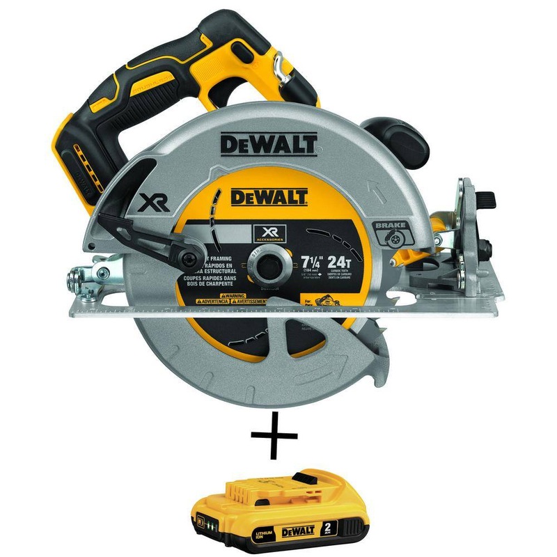 DEWALT DCS570BWDCB203 20V MAX XR Cordless Brushless 7-1/4 in. Circular Saw with Brake and 20V MAX Compact Lithium-Ion 2.0Ah BatteryThe DCS570 provides the end user with the power and depth of cut they receive in a corded circular saw with the portability and convenience of cordless. DEWALT brushless motor technology delivers excellent performance and runtime. Ideal for cross cutting 2X material and ripping sheet goods.Power-brushless motor provides 5200 RPM maintaining speed under loadRuntime of 330 crosscuts in 24 (pine)Capacity: 7-1/4 in. blade provides 2-9/16 in. cutting capacity at 90Ease of use: bevel capacity up to 57 for increased versatilityCross cutting 2X materialRipping sheet goodsIncludes blade and wrenchDCB203 compact lithium-ion pack provides up to 33% longer run-time than standard 20-Volt MAX battery packsDCB203 3-LED fuel gauge system allows immediate feedback on state of chargeDCB203 no memory and virtually no self-discharge for maximum productivity and less downtimeDCB203 lightweight design and quick 45-minute charge timeDCB203 20-Volt lithium-ion battery packDCB203 compatible with the complete line of DEWALT 20-Volt MAX line of tools and accessoriesDCB203 2.0 Ah capacityDimensionsBlade Diameter (in.)7-1/4 inProduct Depth (in.)15.35 inProduct Height (in.)10.808 inProduct Width (in.)8.19 in