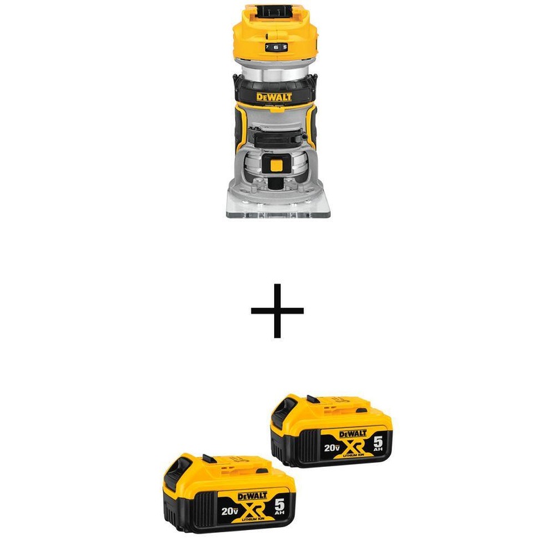 DEWALT DCW600BWCB205-2 20V MAX XR Lithium-Ion Cordless Brushless Fixed Base Compact Router with (2) 20V MAX XR Premium 5.0 Ah Battery PacksDEWALT DCW600B 20-Volt MAX XR Cordless Compact Router Tool provides power like a corded tool while providing the convenience of a cordless router. The plastic fixed base and dual LED lights help to illuminate the work surface and provide superior bit visibility. This cordless woodworking router is equipped with variable speed control for optimal bit speed in each application. The release clamp allows for quick and easy bit and base change. This hand router features an electronic brake which slows the motor down faster after the unit is shut off for greater safety and convenience. Keep your DEWALT 20-Volt MAX Tools running longer with a premium 5.0 Amp hour Lithium-Ion battery packs DCB205-2.