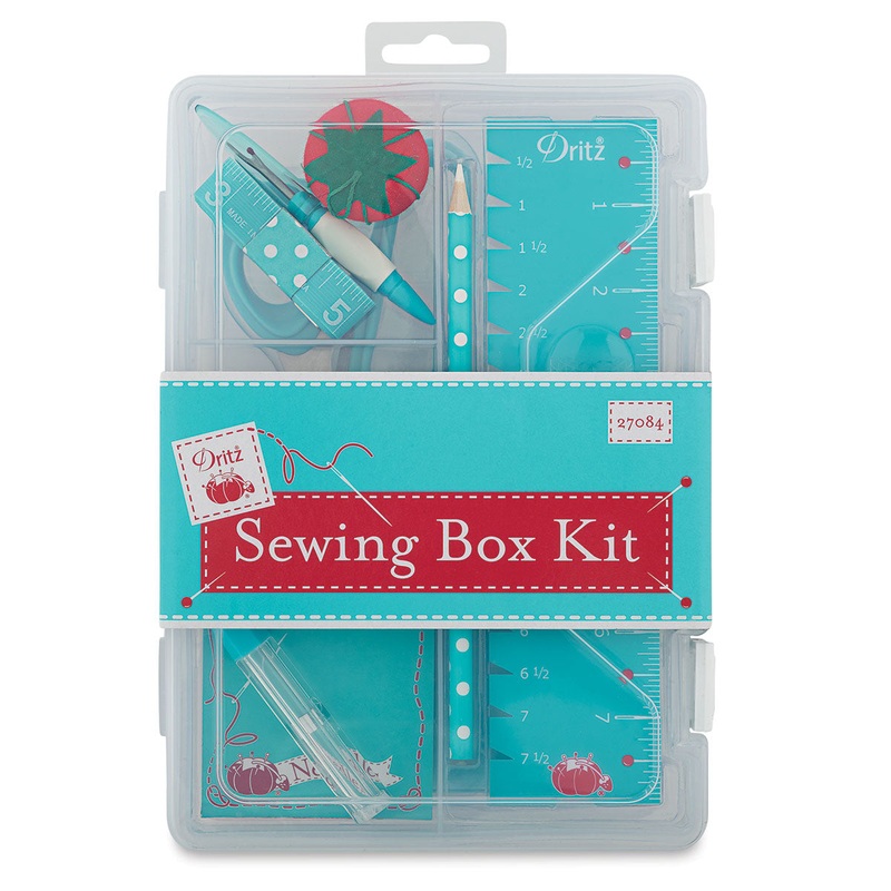 The Dritz Essential Sewing Box Kit – Blue includes all the basic tools needed for a beginner learning to sew or for a pro. This kit includes cutting tools, shears, a pin magnet, hand needles in assorted sizes, a needle storage tube with internal magnet for easy storage and removal of your needles, and glass headpins with heat-resistant heads that can be ironed over without melting. It also comes with a plastic storage box and a tray that can be used to store the tools.