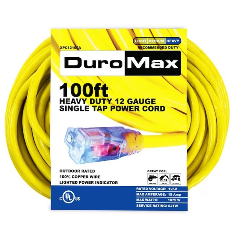 Duromax XPC12100A 100-ft 12 / 1 3 Prong Yellow Indoor/Outdoor Heavy Duty Lighted Extension CordHeavy duty DuroMax power cord is outdoor rated for safe use on the jobsite or in the yard.Bright yellow jacket allows for high-visibility to help prevent accidental cutting and damageReinforced blades minimize bending of prongs and reduces breakageLighted ends allows the user to confirm when power is supplied to cordHeavy duty PVC jacket resists moisture, abrasion and temperatureGrounded plugs allows for safe operationGeneralColor/Finish FamilyYellowSeries NameDuromaxManufacturer Color/FinishYellowTypeLighted extension cordDimensionsCord Thickness7/16-inWeight (lbs.)11Length Measurement100-ftFeaturesAC Voltage120-voltsNumber of Outlets1Amperage15Number of Prongs3ApplicationGeneral purposeOil ResistantNoCord RatingHeavy dutyOverload ProtectionNoGroundedNoPackage Quantity1Indicator LightNoPolarizedNoIndoor/OutdoorIndoor/OutdoorPower Indicator LightYesJacket MaterialPVCUse LocationIndoor/OutdoorLockingNoWater ResistantYesMaximum Amperage20Wattage1800NEMA Configuration5-15PWeather ResistantYesNumber of Conductors1Wire Gauge12CertificationsCA Residents: Prop 65 Warning(s)NoSafety ListingcUL safety listingGFCI ProtectionNo