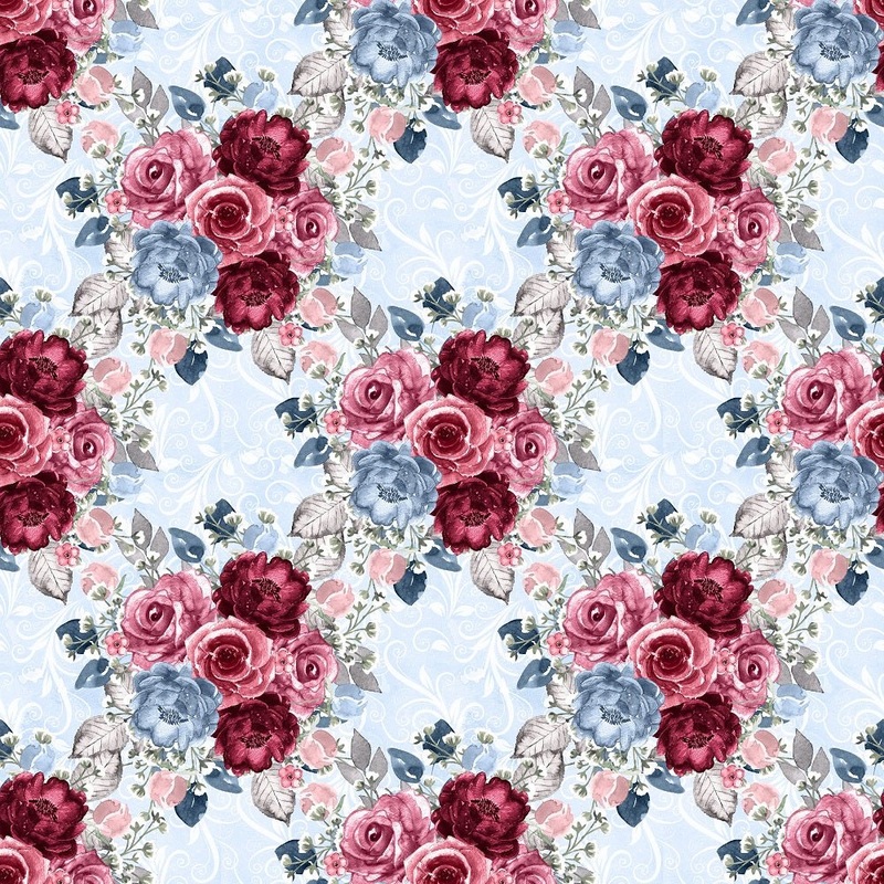 The Blue Dusty Blue and Burgundy Large Bouquets on Vines Fabric is part of the Dusty Blue and Burgundy Fabric Collection printed by Sew Creative Fabrics. Digitally Printed on 100% cotton.