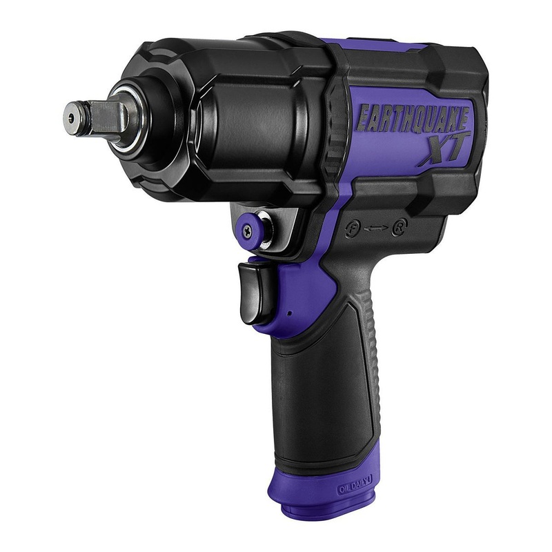 EARTHQUAKE XT1/2 in. Composite Air Impact Wrench, Twin Hammer, 1200 ft-lbs, PurpleThis EARTHQUAKE XT professional grade air wrench handles the toughest jobs with no sweat. The composite impact wrench delivers a pounding 1200 ft-lbs of bolt breakaway torque. The lightweight composite handle reduces strain.1200 ft-lbs of bolt breakaway torque for lightning fast removalPowerful twin-hammer impact mechanism for extreme torque with less vibrationOne-handed push-button FWD/REV with 3-speed rear dial regulatorUltrarugged rubber overmold and lightweight composite housingUltrasilent through-handle exhaust keeps debris away from operatorIncludes protective rubber jacket to keep tool clean and protectedSpecificationsSKU(s): 71412Brand: EARTHQUAKE XTModel: EQ12PXTRecommended Hose Size (in.): 3/8 in.Air Inlet Size: 1/4 in. -18 NPTAir Consumption: 45 SCFM (6.5 CFM @ 90 PSI)Color: PurpleDrive Size: 1/2 in.Housing Material: CompositeSpeed (Max.): 8000 RPMMaximum Torque: 1000 ft-lbsProduct Height: 7-1/2 in.Product Length: 7-7/8 in.Product Weight: 4.4 lb.Product Width: 2-3/8 in.Shipping Weight: 5.02 lb.Working Pressure: 90 PSISound Rating: 90 dBBolt Breakaway Torque: 1200 ft-lbs