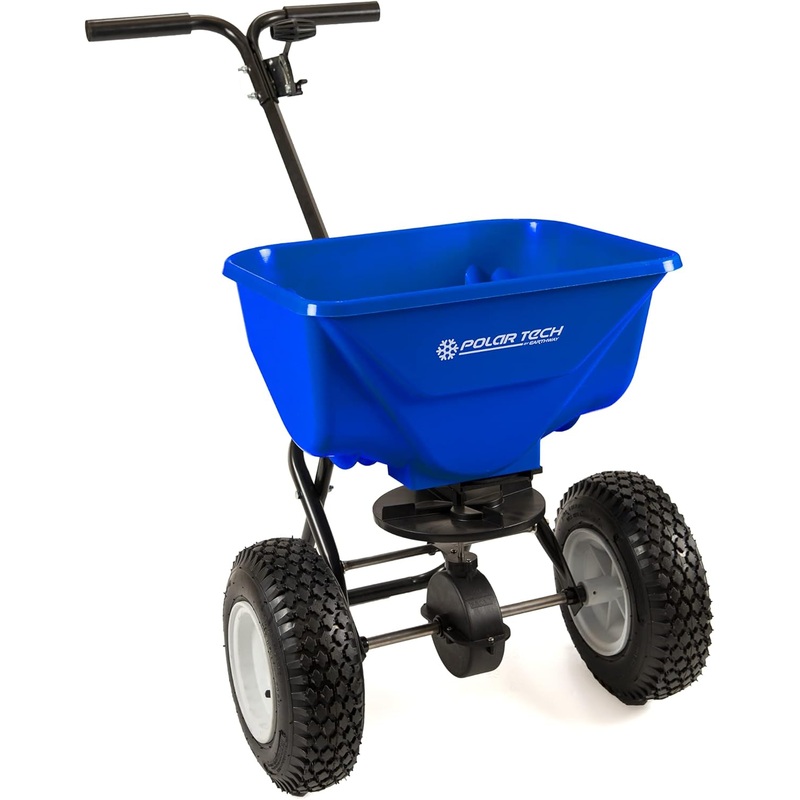 EarthWay 90365 Polar Tech 65 LB (29 KG) Professional Ice Melt Broadcast Walk Behind Spreader with 13 Pneumatic Tires, Adjustable Handle, and Solid Linkage ControlRustproof poly hopper has a maximum capacity of 65 pounds (29 kg) making quick work of any winter task and eliminating the need to stop and refill multiple times.Heavy duty gearbox is self-lubricating and factory sealed to provide consistent, reliable service night and night. Gearbox will have no problem handling your choice of ice melt or rock salt.The 13 inch pneumatic tires will grip to icy pavement and winter conditions without packing. Tires wont get stuck in the ice and snow allowing you to get your work done with ease.Epoxy coated steel frame and adjustable solid linkage controls were designed to last through even the toughest winter conditions. Linkage connects adjustable T-handle. Handle can adjust for those around 6 foot or taller.High output drop system and up to a 15 foot spread with for smooth spreading. High output opening allows for large pieces of ice melt or rock salt, up to 3 inches, to pass through the opening.Product informationPackage Dimensions26.1 x 22.3 x 21.8 inchesItem Weight25.3 poundsManufacturerEarthWay Products IncCountry of OriginUSAItem model number90365