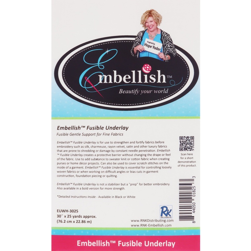 The Embellish Fusible Underlay, available on a convenient 30″ x 25-yard bolt, is the perfect addition to any sewing or embroidery project. Fusible Underlay is a sheer, fusible, premium interlining used to upgrade and protect the integrity of embellished fabric. This product is not a stabilizer; instead, it is underlining that creates a bond with the fabric, forming a protective barrier without changing the drape of the fabric. It adds substance to specialty and loosely woven fabric (lam, loosely woven cotton, silk, satin, taffeta, etc.) to prevent needle penetration from shredding or causing runs in the fabric. It works great as a protective layer to seal the bobbin thread to prevent scratching on onesies and t-shirts. Once fused, it forms a permanent bond with the fabric. Fusible Underlay is made of a premium polyester/rayon proprietorial blend that is super soft and won’t irritate the skin.