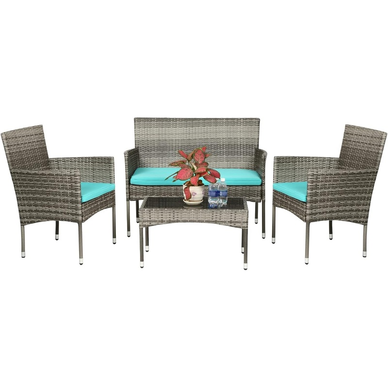 FDW Patio Conversation Set 4 Pieces Outdoor Furniture Set Wicker with Rattan Chair Loveseats Coffee Table for Outdoor Indoor Garden Backyard Porch Poolside Balcony, Gray Wicker/Blue Cushions
