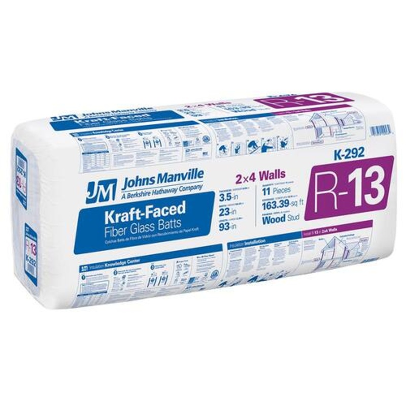 JM Kraft-faced Formaldehyde-free fiberglass insulation comes in a range of R-values, is ideal for moisture control in exterior walls and provides excellent temperature and noise control. Our R-13 Kraft-faced fiberglass insulation is formaldehyde free insulation protected on one side with moisture resistant kraft facing. R-13 Kraft-faced batts come in pre-cut lengths for insulating standard 8 ft. wall cavities. R-13 batts are perfect for insulating exterior 23 in., 2 in. x 4 in. walls where moisture control is required. One bag covers 163.39 sq. ft. Kraft-faced batts are great for new construction, remodels, walls, floors, ceilings, basements, attics and crawlspaces, and are available for wood or steel stud framing. JM insulation is made from bonded glass fibers that are dimensionally stable and will not slump within the cavity, settle or break down during normal applications.