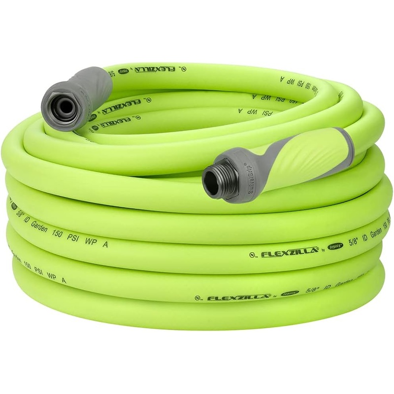 Flexzilla Garden Hose with SwivelGrip, 5/8 in. x 75 ft., Heavy Duty, Lightweight, Drinking Water Safe, ZillaGreen HFZG575YWS-EPremium Flexzilla SwivelGrip Garden Hose makes it easier to work around your home and lawn. SwivelGrip action eliminates twists that occur when uncoiling a hose. Conventional garden hose can trap coils that tighten into kinks as you move across the yard. SwivelGrip allows the hose and grip to rotate independently, releasing coils naturally, easily and effortlessly. The large, comfortable gripping surface on both ends of the hose lets you use the power of your entire hand to make tight connections easy. Flexzilla SwivelGrip Garden Hoses are engineered with a lightweight Flexible Hybrid Polymer which lays flat, eliminates kinking under pressure and is drinking water safe.MALE & FEMALE SWIVELGRIP CONNECTIONS Hose and grip rotate independently, makes connections and uncoiling easy, and naturally releases coils (SwivelGrip Patent Pending)EXTREMELY FLEXIBLE All weather flexibilityEXTREMELY DURABLE Abrasion resistant outer cover and crush resistant anodized aircraft aluminum fittingsHYBRID POLYMER Wont kink under pressure, coils easily and lays flat with zero memoryLIGHTWEIGHT Lighter than traditional garden hoses making Flexzilla easier to carry and maneuver around the yardLEAK FREE CONNECTIONS AND DRINKING WATER SAFE A durable O-ring provides long lasting leak free connections and feature an inner tube material that is drinking water safeSpray nozzle not includedColor: ZillaGreenProduct informationTechnical DetailsManufacturerLegacyPart NumberHFZG575YWSItem Weight11.34 poundsProduct Dimensions13 x 13.5 x 8.75 inchesCountry of OriginTaiwanItem model numberHFZG575YWSSize5/8 x 75ColorZillaGreen w/ SwivelGripStyle5/8 x 75MaterialAluminumPatternGarden HoseItem Package Quantity1Number Of Pieces1Hose Length75 FeetSpecial FeaturesLightweightIncluded Components(1) Flexzilla 5/8 x 75 Hybrid Garden Hose with SwivelGrip 3/4 GHT EndsBatteries Included?NoBatteries Required?NoWarranty DescriptionLimited Lifetime