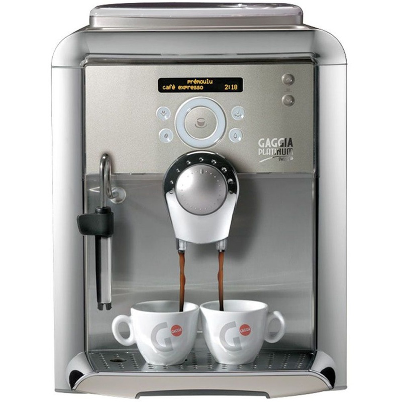 Gaggias focus on innovation optimizes the machines simplicity, ease of use, and most importantly, the quality of each shot of espresso. The Gaggia Platinum Swing Up Super-Automatic Espresso Machine is characterized by a user-friendly interface a circular dial in the center works similar to an iPod click wheel, allowing you to swing your finger to select the function. Above this touch ring dial is the 24-character LCD screen, which shows your beverage options and programming choices.