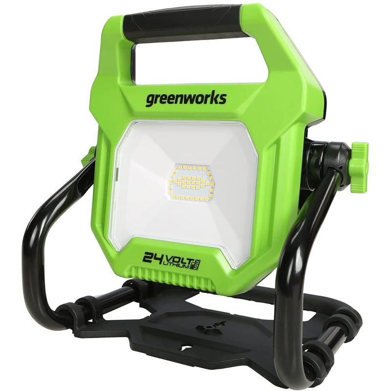 Greenworks 24V AC/DC 2000-Lumen LED Work Light (Tool-Only), 3502302AZThe Greenworks 24V lithium-ion platform powers over 50 indoor and outdoor products, including lawn mowers, blowers, string trimmers, chainsaws, power tools, and more! The 24V lithium-ion battery provides 20% more power and 35% more run-time, and delivers fade-free power with no memory loss after charging. The outdoor power equipment allows you to tackle up to 1/4 acre with the available 1.5Ah, 2Ah, 4Ah, and 5Ah batteries. USB ports are integrated into the BAG711, BAG708, BAG709, BAG710 batteries, making it a portable charger for phones, tablets, and other compatible electronic accessories.Greenworks 24V (AC / DC) LED light can be powered with an extension cord or with a 24V battery perfect for worksites and camping (battery charger sold separately)360 degree rotating head allows for full light in any spaceProvides 2000 lumens of light outputIntegrated LED will never need to be replacedPush button ON / OFF switchCushioned over mold grip