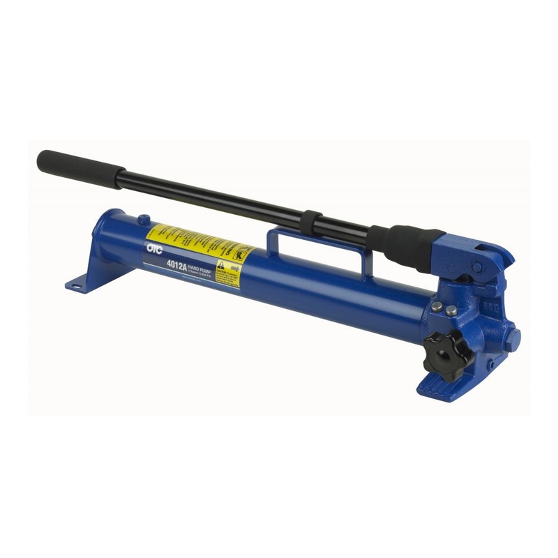 The 4012A two-speed hand pump’s all-metal construction almost eliminates the chance of leaking, or damage to the pump from regular use or accidents. It’s the perfect pump for use with single-acting rams or combinations where 45 cu. In. of usable oil capacity will do the job. Has 2-way valve; welded steel carrying handle; automatic switching from low to high pressure mode; handle effort under 140 lbs. at 10,000 PSI; unique fill cap to prevent over-filling and over-pressurization; non-vented reservoir; fingertip control valve with 180 degree throw for on/off control. In other words, this pump has it all!