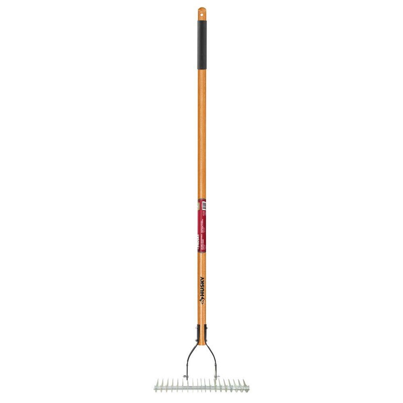 Husky 77113-950 54 in. Long Wood Handle 19-Tine Adjustable Thatch RakeTransform your lawn care routine and uncover the lush, green oasis that awaits with The Husky 54 in. Long Wood Handle 19-Tine Thatch Rake with Cushion Grip, the perfect solution to help you maintain a lush, healthy yard with ease. This all-purpose lawn rake is uniquely crafted to clear dead grass clippings and promote a thriving outdoor environment. This innovative rake features carefully engineered curved tines that are designed to sweep away dead grass clippings, ensuring that your lawn receives the essential sunlight, air, water, and fertilizers for optimal growth.This rake is ideal for preparing your lawn for fertilizing reseeding. Boost your lawns health and elevate your outdoor space with this powerful thatching rake, designed with your comfort and yard in mind. At Husky, we stand behind the quality and durability of our products, which is why we offer a manufacturer lifetime warranty.Maximize efficiency on all types of ground with an easily adjustable blade. No matter your lawns terrain, our rake adapts to provide you with the best results possible.Designed to remove dead grass and clippings and ideal for preparing your lawn for fertilizing and reseeding.Equipped with straight steel teeth, perfect for thatching your lawn.Long Wood Handle with Comfort Grip to make your lawn maintenance tasks effortless and comfortable, improving extended use without strain.DimensionsHandle Length (in.)54Product Depth (in.)61.4 inProduct Height (in.)5 inProduct Width (in.)14.75 inRake Width (in.)5Tine length (in.)5DetailsFeaturesRotary BladesGarden Tool Handle StyleCushioned GripHandle MaterialWoodNumber of tines19Product Weight (lb.)5.4 lbRake Tine Length (in.)5-6.99Rake TypeThatching RakeShapeBowTine MaterialSteel