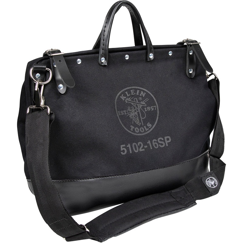 General InformationBrandKlein ToolsPart Number510216SPBLKProduct TypeDeluxe Black Canvas Tool Bag, 16-InchApplicationTool StoragePackagingRetailCountry of OriginUnited StatesUPC092644200298California ResidentsProposition 65 WarningPhysical CharacteristicsColorBlackMaterialNo. 8 Black CanvasLength16” (40.6 cm)Width6” (15.2 cm)Height14” (35.6 cm)Weight3.7DetailsFeaturesConstructed with heavy-duty No. 8 black canvas