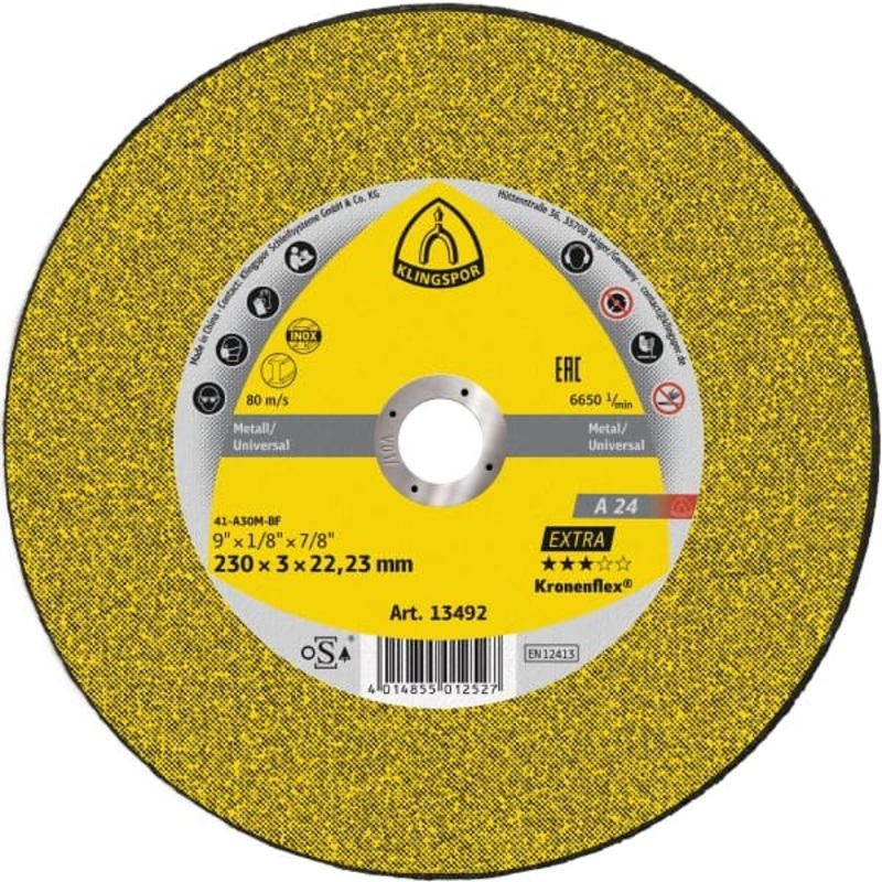 Klingspor Kronenflex universal cutting-off disc 230mm x 3mm x 22.23mm, suitable for all sectors of metalworking.