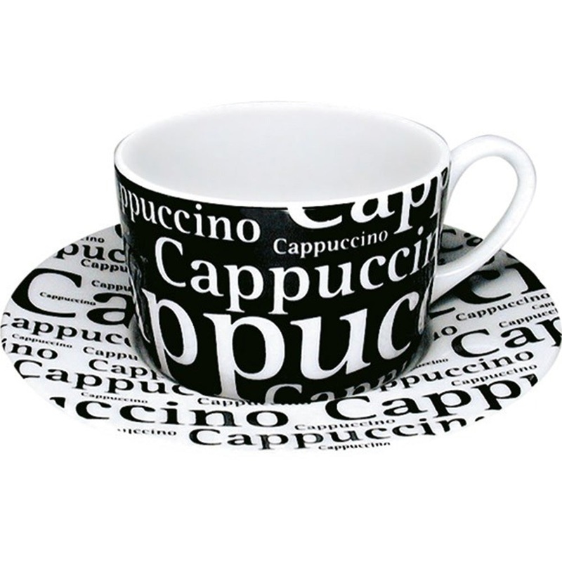The high-contras Konitz 7oz Writing Cappuccino Cup and Saucer lets you serve your favorite drinks in style. This set features a black mug with the word Cappuccino written in white letters. The accompanying saucer showcases black letters on a crisp white background. Both the cup and saucer are made of porcelain. The Konitz 7oz Writing Cappuccino Cup and Saucer are dishwasher and microwave safe.