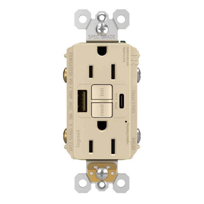 Legrand 1597TRUSBACI radiant 15 Amp 125-Volt Tamper Resistant GFCI Residential/Commercial Decorator Duplex Outlet with A/C USB, IvoryThe radiant collection is a step up from the standard with simple, classic options in wiring devices, home automation controls and screwless wall plates that complement todays homes. GFCI protection meets modern convenience with this clever integration of 2 USB charging outlets, which provide 2.1 Amp of combined charging power right alongside GFCI outlets. The radiant USB charging solutions let you charge more of your devices without the need for bulky AC adapters.Charge 2 mobile phones or tablets simultaneously with 2 USB type A charging ports with tamper-resistant outletsConducts an automatic test every 3-seconds, ensuring its always ready to protect if the device fails the test, the trip indicator light (red LED) flashes to signal that the GFCI should be replacedTotal charging capacity of 2.1 Amp, shared between stainless steel type a and type C USB ports rated at 10,000 insertion cyclesProtects children: patented shutter system helps prevent improper insertion of foreign objects-now with black invisi-shutters for an invisible effect preferred by end usersReplaces any standard outlet with ease all you need is 15-minutes and a screwdriverDurable: withstands 100X the required UL surge test cycleBack and side wire terminals accommodate #14 AWG #10 AWG stranded and solid copper wire for installation flexibilityPrevents line-load reversal miswire: no power to the face or downstream receptacles if wired incorrectlyDual-direction test and reset button colors match the device faceCaptivated mounting screws offer hassle-free installationDimensionsOutlet Depth (in.)2.15Outlet Height (in.)4.2Outlet Width (in.)1.25DetailsAmperage (A)15 AColor FamilyYellowColor/FinishIvoryCommercial/ResidentialResidentialConfigurationUSB-A, USB-CDevice Style TypeOutlet w/o Wall PlateDurabilityNot ApplicableElectrical FeaturesNo Additional FeaturesGroundingGroundedIncludedMounting HardwareIndoor/OutdoorIndoorMaximum Amperage (A)15 AMounting TypeIn-WallNEMA ConfigurationNEMA 5Number of Poles3Number of Ports2Number of Receptacles2Outlet ConfigurationDuplexOutlet LocationWallOutlet MaterialNylonOutlet TypeGFCIPackage Quantity1Plug Configuration5-15RatingGeneral Purpose, Tamper ResistantReceptacle Configuration5-15Voltage125 voltVoltage (V)125 VWire Connection LocationBackWire Connection TypeScrew TerminalAdditional ResourcesFrom the ManufacturerProject IdeasProduct BrochureWarrantyInstallation Guide