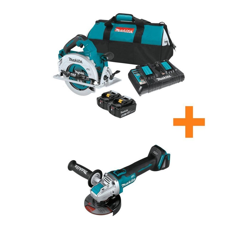 Makita XSH06PT-XAG25Z 18V X2 LXT (36V) Brushless 7-1/4 in. Circular Saw Kit 5.0Ah with 18V LXT Brushless X-LOCK Angle GrinderMakita, a pioneer in brushless motor technology and battery innovation, combines both in the 18V X2 (36V) LXT Lithium-Ion Brushless 7-1/4 in. Circular Saw Kit (XSH06PT). Its powered by two 18V LXT Lithium-Ion batteries for maximum performance and has an electronically controlled BL Brushless motor that matches torque and RPM to the application. Makita 18V X2 means freedom from the cord, even for demanding applications like cutting sheet and dimensional lumber that traditionally called for a corded saw. Best of all, users can remain in one battery platform, using the same fast-charging 18V batteries with the XSH06PT as they use across the expansive Makita 18V LXT cordless tool system. The XSH06PT has a long list of features for efficient cutting without the cord. The electronically controlled brushless motor delivers a full 6,000 RPM for efficient cutting, with Automatic Speed Change technology to adjust the cutting speed and torque under load for optimum performance. In internal testing, the XSH06PT made up to 610 crosscuts per charge in 24 SPF lumber and up to 320 crosscuts per charge in 210 SPF lumber using two fully charged 5.0Ah batteries. Added features include a large 2-5/8 in. cutting capacity at 90, and an electric brake for maximum productivity. This Promotion also comes with a bonus XAG25Z 18V LXT Lithium-Ion Brushless Cordless 4-1/ 2 in. /5 in. X-LOCK Angle Grinder with AFT, Tool Only.