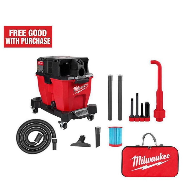Milwaukee 0920-20-49-90-2026-49-90-2019 M18 FUEL 9 Gal. Cordless Dual-Battery Wet/Dry Shop Vacuum with AIR-TIP 1-1/4 in. 2-1/2 in. Right Angle Tool and BagThe Milwaukee M18 FUEL 9 Gal. Wet/Dry Vacuum brings unmatched performance, durability and versatility to jobsite cleanup. The POWERSTATE Brushless Motor and optimized components Outperform 4.25 Peak HP Wet/Dry Vacuums, delivering more cleaning power than corded. The Dual-Battery Motor Head requires 2 M18REDLITHIUMBatteries to operate and cleans up more common jobsite debris like drywall dust, concrete dust and wood/metal shavings than 4.25 peak HP wet/dry vacuums in the same amount of time. The Milwaukee AIR-TIP 4-in-1 Right Angle Cleaning Tool can reach around a variety of obstacles with its right angle design. The gradual bend and right angle design can be used around pipes, near walls and in a variety of tight access cleaning situations. The 4-in-1 Right Angle Cleaning Tool comes with 4 different interchangeable tips for more cleaning versatility. Included are a Short Crevice Tip, Bottom-Opening Tip, Brushed Tip and Long Crevice Tip. The Milwaukee Vacuum Tool Storage Bag provides a durable and versatile storage solution for vacuum tools that attach to the top of select Milwaukee Wet/Dry Vacuums. Kit includes: 0920-20 M18 FUEL 9 Gal. Cordless DUAL-BATTERY Wet/Dry Shop Vacuum with Filter, Hose and Accessories, 49-90-2026 AIR-TIP 1-1/4 in. 2-1/2 in. 4-IN-1 Right Angle Tool Wet/Dry Shop Vacuum Attachment (5-Piece) and 49-90-2019 Wet/Dry Shop Vacuum Tool and Attachment Storage Bag (1-Piece).