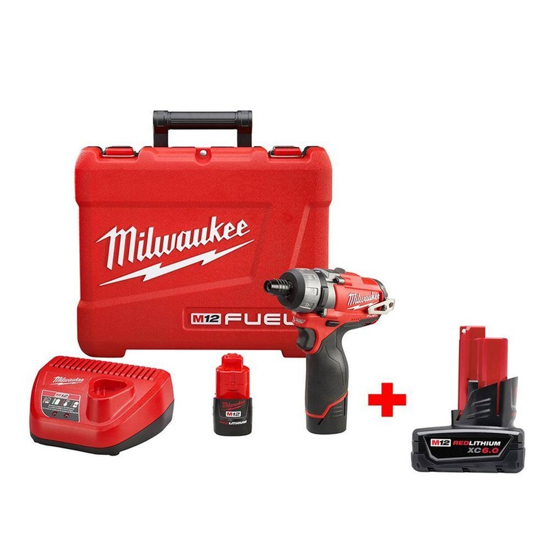 Milwaukee 2402-22-48-11-2460 M12 FUEL 12V Cordless 1/4 in. Hex 2-Speed Screwdriver Kit with M12 6.0 Ah Battery PackMilwaukees M12 FUEL Brushless 2-Speed Screwdriver Kit delivers exceptional productivity in a compact size. The POWERSTATE Brushless Motor offers constant power output while still running cool with no wearable components. Powered by a Red Lithium 2.0 battery pack that delivers more power and twice the recharges of standard lithium-ion batteries, your tool is conditioned for peak performance even in extreme job site conditions. The battery also features REDLINK PLUS Intelligence, a technology designed to ensure maximum performance and protection from overload, overheating and over-discharge. The kits compact size allows you to work easily in tight spots, while the built-in LED light offers visibility in dark or confined areas. Includes A Free M12 12-Volt Redlithium XC 6.0Ah Extended Capacity Battery Pack (48-11-2460).