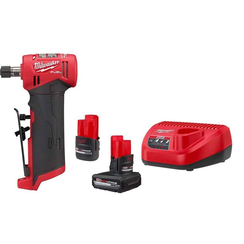 Milwaukee 2485-20-48-59-2452S M12 FUEL 12-Volt Lithium-Ion 1/4 in. Cordless Right Angle Die Grinder with High Output 5.0/2.5 Ah Batteries and ChargerThe MILWAUKEE 1/4 M12 FUEL Right Angle Die Grinder is the first cordless right angle die grinder that delivers the performance, size, and speed professional service mechanics demand. The die grinder delivers 20% more power than pneumatic competition and features the Milwaukee POWERSTATE Brushless Motor Technology. The cordless die grinder provides users with up to .3 HP performance, best-in-class size to help fit in tight places, and offers users greater mobility and access. The M12 Die Grinder features a 4-Mode speed control and responsive variable-speed trigger giving users unmatched control. The M12 REDLITHIUM HIGH OUTPUT Starter Kit delivers 25% more power and runs 25% cooler than our other M12 REDLITHIUM XC battery packs. The increase in power elevates the performance of the entire M12 system and drives the next breakthrough in M12 FUEL.20% more power than Pneumatic0.3 HP motor output3-mode RPM controlGreater mobility and accessOptimum performance with 2 in. accessoriesPOWERSTATE brushless motor technologyM12 REDLITHIUM Battery TechnologyPart of the M12 systemIncludes, 1 M12 Fuel 1/4 in. right angle die grinder (2485-20), 2 wrench, 1 M12 5.0 HO battery (48-11-2450), 1 M12 2.5 HO battery (48-11-2425), and 1 M12 charger (48-59-2401)DimensionsProduct Depth (in.)4.4 inProduct Height (in.)7.8 inProduct Width (in.)2 inWheel Diameter (in.)2 in