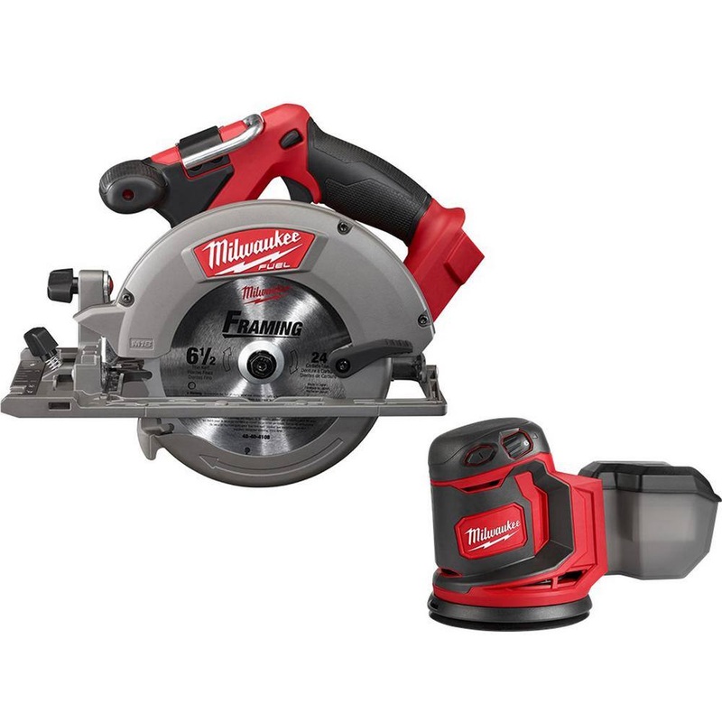 Milwaukee 2730-20-2648-20 M18 FUEL 18V Lithium-Ion Brushless Cordless 6-1/2 in. Circular Saw with M18 5 in. Random Orbit SanderThe MILWAUKEE M18 FUEL 6-1/2 Circular Saw is the fastest saw in its class, offering up to 30% faster cutting, 2X more runtime and 3X longer tool life than competitive saws. The POWERSTATE Brushless Motor outpowers all other 18-Volt cordless circular saws and allows you to perform jobs that previously required a corded tool. The saws REDLINK PLUS Intelligence ensures optimized performance and protection from overloading, overheating and over-discharging. The 18-volt lithium-ion circular saws guards and shoe are built of cast magnesium to provide a durable, lightweight base. The saw also features an integrated LED light and a rafter hook for convenient storage on the job. The saw includes a blade wrench and a blade. The MILWAUKEE M18 5 Random Orbit Sander delivers corded power with 12,000 Max OPM output. The orbital sander features a 7,000-12,000 variable speed dial providing you with more control over the output of the tool to match the orbit speed for the application. The tools powerful motor allows you to remove more material per battery charge, increasing your productivity.