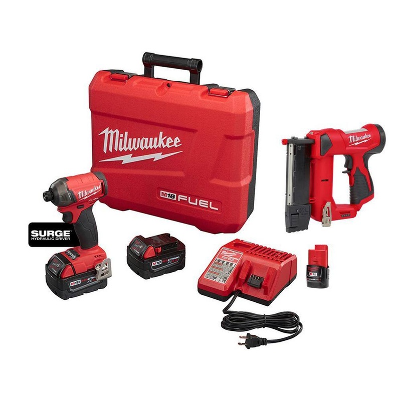 Milwaukee 2760-22-2540-20-48-11-2420 M18 FUEL SURGE 18V Lithium-Ion Brushless Cordless 1/4 in. Hex Impact Driver Kit with M12 Pin Nailer & 2.0 Ah BatteryThe M18 FUEL SURGE Cordless Brushless 1/4 in. hex Hydraulic Impact Driver is the quietest cordless fastening solution on the market. with Milwaukees new FLUID-DRIVE Hydraulic Powertrain, users will experience up to 50% quieter operation, 3X less vibration for smoother operation and faster driving speeds compared to standard impacts. The POWERSTATE Brushless Motor delivers up to 0 RPM to 3,000 RPM with constant power output to drive screws faster. REDLINK PLUS intelligence is the most advanced electronic system on the market, preventing damage to the tool and battery caused by overloading or overheating. For use with REDLITHIUM Compact Batteries or Extended Capacity Batteries which deliver more work per charge and more work over the life of the pack than competitive batteries on the market. The 4-Mode DRIVE CONTROL provides greater control over output speed and power for greater versatility. Self-Tapping Screw Mode is designed to reduce walking when starting self-tapping screws as well as reduce overdriving, breaking and stripping out screws. The Milwaukee M12 23-Gauge Pin Nailer is the most compact cordless pin nailer, combining precision and power to deliver the performance that professional carpenters and remodelers demand, without the hassle of a compressor hose or gas cartridge.Fluid-drive hydraulic powertrain reduces metal on metal contact within the tool, delivering quieter operation, smoother performance and increased durability over a standard impactPOWERSTATE brushless motor outperforms all leading competitorsREDLINK PLUS intelligence prevents damage to the tool and battery due to overloading or overheatingREDLITHIUM batteries deliver more work per charge and more work over the life of the battery4-mode DRIVE CONTROL provides greater control over output speed and powerCompatible with all M18 batteriesIncludes: one M18 FUEL SURGE 1/4 in. hex hydraulic driver (tool-only) (2760-20), two M18 REDLITHIUM XC 5.0 Ah extended capacity battery pack (48-11-1850), one M18 and M12 multi-voltage charger (48-59-1812), 1 bit holder, 1 carrying case, 1 belt clip, 1 M12 23GA pin nailer, 1 M12 2.0Ah batteryPart of the M18 system, featuring over 250 plus toolsNo pneumatic hose or gas cartridgeDetailsBattery Amp HoursMultiple BatteriesBattery Power TypeLithium IonBlows per Minute (BPM)0Charger IncludedCharger IncludedColor FamilyRedConditionNewCordless Tool TypeImpact DriverCordless/CordedCordlessDrill/ Driver TypeImpact DriverDrive Size1/4 In. HexIncludedBelt Clip, No Additional Items Included, Tool CaseMaximum Speed (RPM)3000 RPMMotor TypeBrushlessNumber of Total Batteries Included3Power Tool FeaturesKeyless Chuck, LED Light, Variable SpeedTorque (In-Lbs)450Voltage (V)18 V
