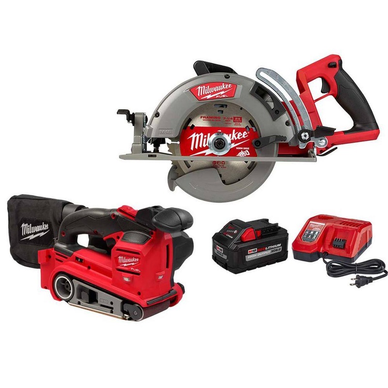 Milwaukee 2830-20-2832-20-48-59-1880 M18 FUEL 18V Lithium-Ion Cordless 7-1/4 in. Rear Handle Circular Saw w/M18 FUEL Belt Sander and 8.0ah Starter KitDesigned for the professional carpenter, remodeler and general contractor, the M18 FUEL Rear Handle 7-1/4 in. Circular Saw from Milwaukee can Generate the Power of 15 Amp corded saws, cut faster than 15 Amp corded saws and delivers users up to 570 cuts per charge. The POWERSTATE Brushless Motor provides 5,800 RPM and higher speeds under load for corded cutting performance. REDLINK PLUS intelligence ensures maximum performance and protection from overload, overheating and over discharge. The M18 REDLITHIUM HIGH OUTPUT HD12.0 battery delivers unmatched run-time. An electric blade break, LED work light, all magnesium guards and shoe the saw will keep users productive and provide the durability to handle the toughest jobsite conditions. A multi-sized rafter hook allows the saw to be easily stored on different materials and gears that dont require oiling and maintenance means users can reduce down time and get jobs done faster.