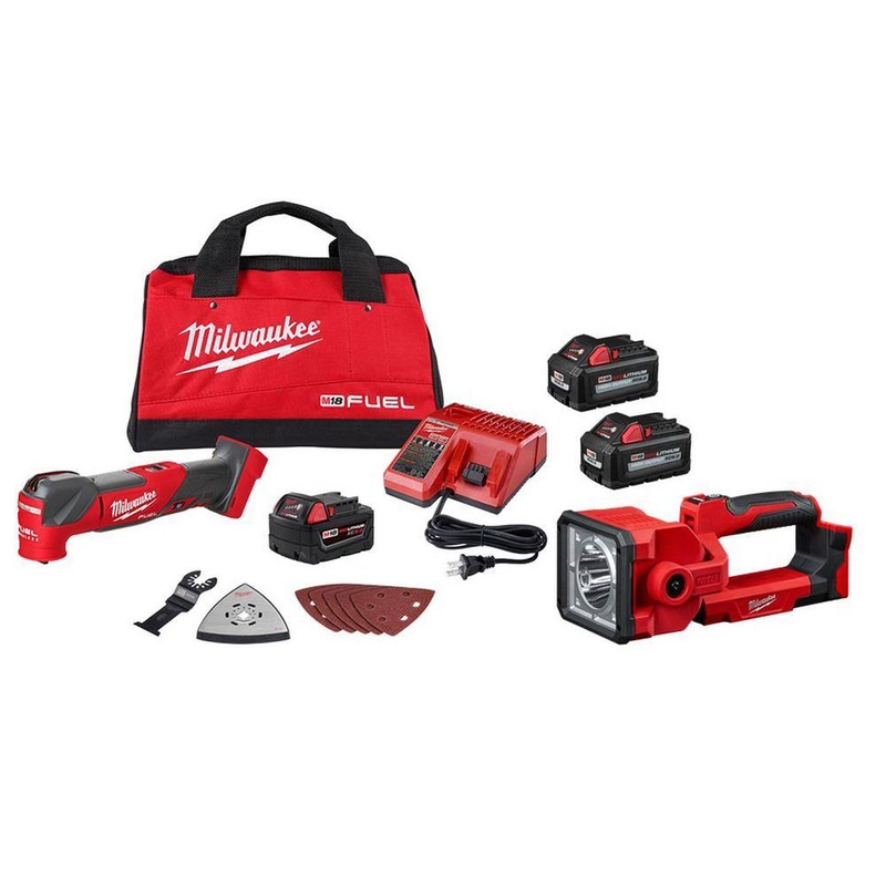 Milwaukee 2836-21-2354-20-48-11-1862 M18 FUEL 18V Lithium-Ion Cordless Brushless Oscillating Multi-Tool Kit with LED Search Light and (2) 6.0Ah BatteriesThe Milwaukee M18 FUEL Oscillating Multi-Tool Kit generates the fastest cuts, the power for demolition, and the lowest full tool vibration. The POWERSTATE Brushless Motor delivers 10,000 OPM to 20,000 OPM with an aggressive 4.2 oscillation angle to deliver the fastest cuts over the competition. The cordless multi-tool also gives users the power to complete many demanding applications with ease, such as large cuts through hardwoods and nail embedded wood, pushing the limits of what a multi-purpose oscillating tool can do. Vibration dampening technology delivers the lowest full tool vibration, letting users make cuts more comfortably with less fatigue. REDLINK PLUS Intelligence ensures users achieve unmatched levels of performance, protection, and compatibility. The M18 FUEL Oscillating Multi-Tool has a 10-Setting Dial with an additional Auto-Load Feature, allowing users to adjust the speed to the application. An integrated 180 LED light provides maximum visibility in low-light situations. The Milwaukee M18 Search Light allows users to spot farther and flood brighter, giving users versatility, performance, and durability all in 1-light. The searchlight has a pivoting head that provides 1,250 Lumens of TRUEVIEW High Definition Output and over 730 yds. of beam distance to spot objects and areas at a far distance. The M18 REDLITHIUM HIGH OUTPUT XC6.0 Battery Pack provides 50% more power and runs 50% cooler vs M18 REDLITHIUM XC battery packs.Fastest cuts, power for demolition, lowest full tool vibration4.2 oscillation angle with 10,000 OPM to 20,000 OPM cut speedPart of the M18 system, with over 250 plus cordless solutionsTool free blade change for faster accessory changesVariable speed dial to allow users to adjust the speed to the applicationFully compatible with the M18 system, featuring over 250 plus toolsPOWERSTATE brushless motor: purposely built for the M18 FUEL oscillating multi-tool combined with 10,000 OPM to 20,000 OPM delivers fastest speed of cutREDLINK PLUS intelligence: most advanced system of electronics in the industry, enabling communication between batteries and tools, allowing for unmatched levels of performance, protection, and compatibilityREDLITHIUM battery pack: superior pack construction, electronics, and performance deliver more work per charge and more work over pack lifespan than any battery on the marketAuto-load feature to allow the user to start slowly when making precise cuts, and automatically ramp up to the highest speed once under load, to provide unmatched productivity180 span LED light for better visibility in low-light situationsOscillation angle: 4 for fastest cuttingVibration Dampening technology for lowest full tool vibrationCompatible with all M18 batteriesTRUEVIEW high definition output provides neutral white color and produces an even beam pattern for clearer visibilityIncludes: one 2836-20 oscillating multi-tool, one M18 XC5.0 Ah battery, one M18 charger, 1 wood cutting blade, 1 sanding pad, 5 sanding sheets, 1 contractor bag, one 2354-20 M18 Search Light, 2 M18 REDLITHIUM HIGH OUTPUT XC 6.0 Ah battery packsDimensionsProduct Depth (in.)12.17 inProduct Height (in.)3.89 inProduct Width (in.)2.53 in