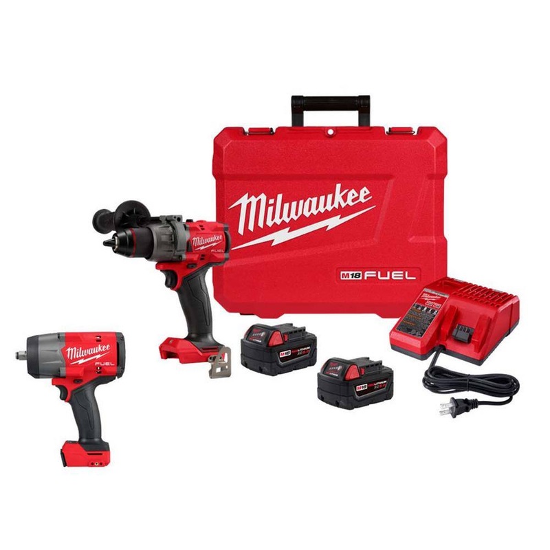 Milwaukee 2904-22-2967-20 M18 FUEL 18V Lithium-Ion Brushless Cordless 1/2 in. Hammer Drill Driver Kit with M18 FUEL High-Torque Impact WrenchThe Milwaukee M18 FUEL Hammer Drill Driver is the Industrys Most Powerful Hammer Drill, delivering the capability to drill the largest holes at high speed into the densest materials. The cordless drill is the Most Compact solution in its class and features AutoStop Control Mode for Enhanced Safety. The POWERSTATE Brushless motor delivers the most power under load to complete 2-9/16 in. Self-Feed holes in dense woods for increased productivity. At only 6.9 in. L, this is the most compact cordless drill in its class for the best access and maneuverability in tight spaces. The AutoStop Control Mode offers enhanced safety for the operator by preventing over-rotation in a bind-up with the best reaction time in the industry. The REDLINK PLUS intelligence ensures maximum performance and protects from overloads, heating, and over-discharge. The all metal ratcheting chuck is the best-in-class. This provides increased grip strength, durability, and corrosion resistance. The Milwaukee M18 FUEL High Torque Impact Wrench w/ Friction Ring is the most power-dense impact wrench in its class, provides greater access in tight spaces, and maximizes productivity through faster removal speeds. The M18 FUEL High Torque Impact Wrench w/ Friction Ring maximizes productivity on the jobsite and in the shop by removing stubborn bolts and fasteners faster than cordless competitors.