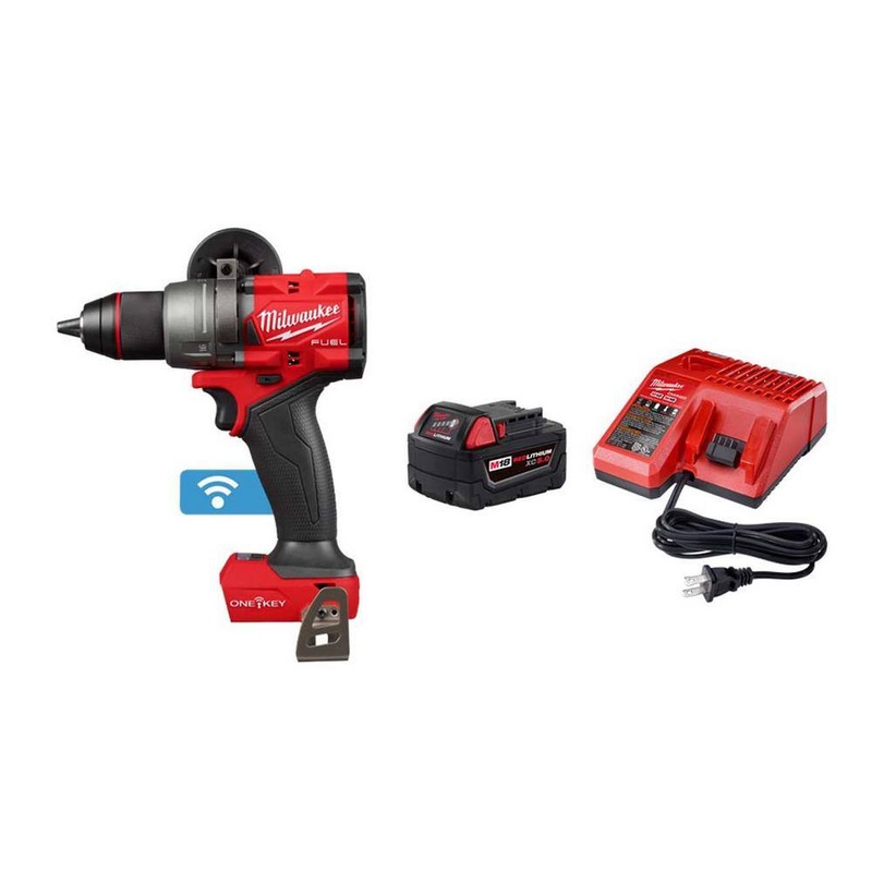 Milwaukee 2906-20-48-59-1850 M18 FUEL ONE-KEY 18-Volt Lithium-Ion Brushless Cordless 1/2 in. Hammer Drill/Driver with M18 5.0Ah Battery and ChargerThe MILWAUKEE M18 FUEL Hammer Drill Driver w/ ONE-KEY is the Industrys Most Powerful Hammer Drill, delivering the capability to drill the largest holes at high speed into the densest materials. This cordless drill is the Most Compact solution in its class and features AUTOSTOP Control Mode for Enhanced Safety. The POWERSTATE Brushless motor delivers the most power under load to complete 2-9/16 Self-Feed holes in dense woods for increased productivity. At only 6.9 in length, this is the most compact cordless drill in its class for the best access and maneuverability in tight spaces. The M18 REDLITHIUM XC5.0 Starter Kit delivers up to 2.5X more runtime, 20% more power and 2X more recharges than standard lithium-ion batteries. The lithium-ion battery pack features superior pack construction, electronics, and performance providing users more work per charge and more work over pack life than any battery on the market.Most powerful hammer drillOnly 6.9 in. L for access into tight spaces and reduced fatigueAUTOSTOP control mode, enhanced safetyPOWERSTATE brushless motor delivers the power to complete the widest range of applications of any hammer drill driverFastest drilling and driving applications under loadAUTOSTOP feature to protect from over rotation in a bind up for enhanced safety, equipped with a dedicated AUTOSTOP light on foot of tool to indicate a protection event1/2 in. all-metal chuck with carbide teeth for maximum durability, grip and bit retentionMechanical Clutch for consistency in driving a wide range of fastenersUnmatched performance with the most runtime in class with the XC5.0Ah batteriesHammer drill mode for fast drilling into brick, block or concreteAll-metal belt clip for portability1400 in./lbs. of torqueLED light for better visibility in low-light situationsIncludes: M18 FUEL W/ ONE-KEY HAMMER DRILL BT, side handle, belt clipDimensionsProduct Depth (in.)6.95 inProduct Height (in.)8.5 inProduct Width (in.)2.38 in