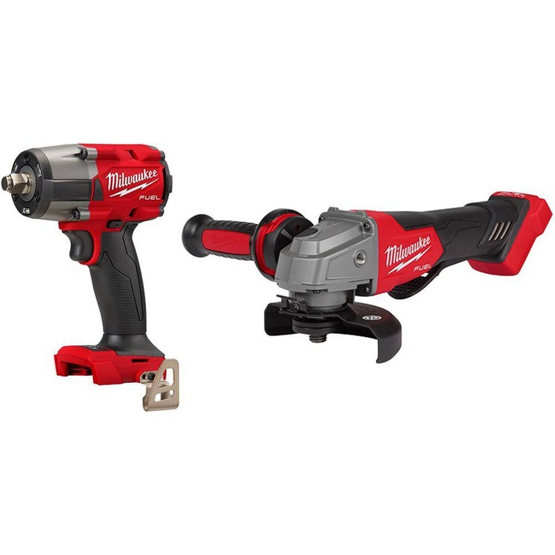 Milwaukee 2962-20-2880-20 M18 FUEL Gen-2 18V Lithium-Ion Brushless Cordless Mid Torque 1/2 in. Impact Wrench with Friction Ring with GrinderMilwaukee m18 fuel 1/2in. Mid-torque impact wrench with friction ring delivers best power-to-weight ratio, most access in tight spaces, and faster removal speed. It provides 650 ft-lbs of nut-busting torque and only weighs 5.1 lbs, making it extremely versatile, and capable of performing a wide variety of applications. Its powerstate brushless motor generates power needed to quickly perform many tasks, such as removing large bolts or lug nuts. Tri-leds surround anvil to deliver brighter light with fewer shadows. 4-mode drive control offers greater precision with a range of pre-set rpm and ipm levels, selectable from a single button on tool. By selecting mode 4, auto shut-off control applies no more than 35 ft-lbs of torque for hand-tight fastening applications to prevent overtightening. Mode 4 also features bolt removal control that delivers users full torque output, n decreases rpms once bolt is loosened to prevent fastener drops. Redlink plus intelligence ensures maximum performance, protecting tool against overloads, over-heating and over-discharge.Milwaukee m18 fuel 4-1/2/5in. Grinder paddle switch, no lock is next advancement in power and performance, generating 11 amp corded power, fastest cutting, and delivering up to 135 cuts per charge.Friction ring (hog ring) ensures quick and easy socket changes6.0 in. L provides most access in tight spacesFaster removal speed provides increased user productivityTri-LEDs deliver high definition lighting to increase workspace visibility with less shadows4-mode DRIVE CONTROL provides greater control over output speed and power, includes auto shut-off and bolt-removal controlAuto shut-off control applies no more than 35 ft./lbs. of torque for hand-tight fastening applications to prevent overtighteningBolt removal control delivers full torque output, then decreases RPMs once the bolt is loosened to prevent fastener dropsMode 1 RPMs: 0-1,250, mode 2 RPMs: 0-1,950, mode 3 RPMs: 0-2,575, mode 4 RPMs: 0-2,575Mode 1 IPMs: 0-900, mode 2 IPMs: 0-2,100, mode 3 IPMs: 0-3,100, mode 4 IPMs: 0-3,100REDLINK PLUS intelligence ensures maximum performance and protects from overloads, heating and over-dischargeWorks in up to 69 kV environmentsCompatible with all M18batteries and chargersIncludes: M18 FUEL 1/2 in. mid-torque impact wrench with friction ringIncludes: 1 M18 FUEL 4-1/2 in./5 in. grinder paddle switch, no-lock (2880-20), (1) T27 guard, 1 T1 clip-on guard, 1 side handle, 1 spanner wrench, 1 back flange, 1 flange nut5/8 in.-11 in. spindle for use with common grinding accessoriesDimensionsDrive Size (in.)1/2 in.Product Depth (in.)6.0 inProduct Height (in.)8.12 inProduct Width (in.)2.74 in
