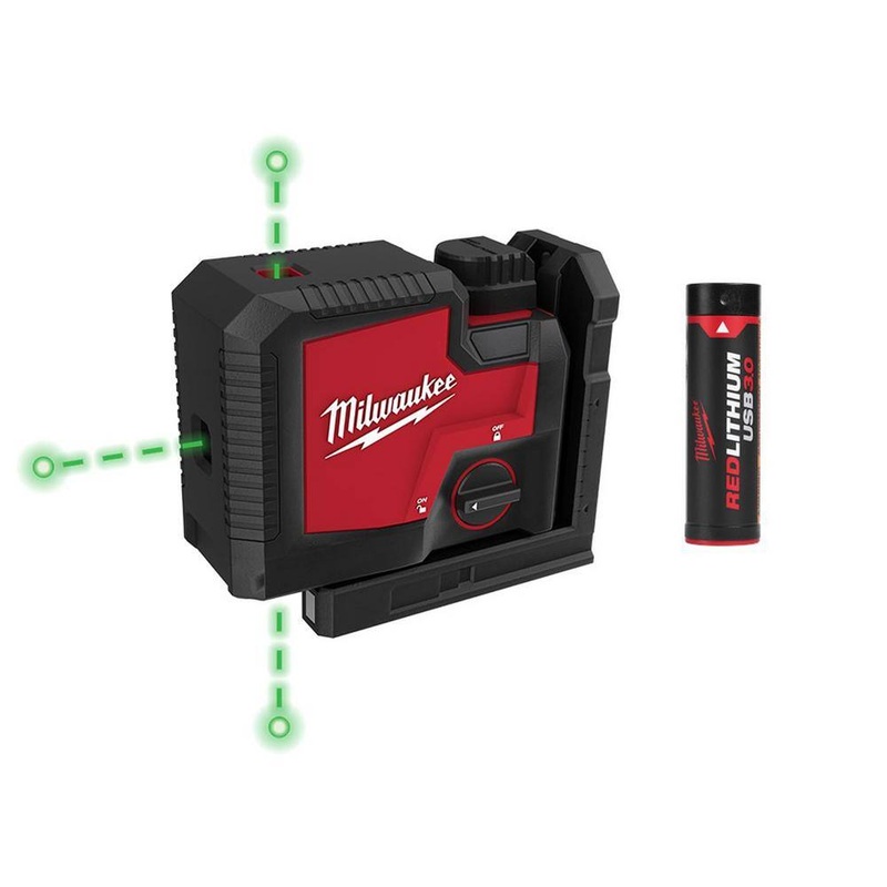 Milwaukee 3510-21-48-11-2131 Green 100 ft. 3-Point Rechargeable Laser Level with (2) REDLITHIUM Lithium-Ion USB Batteries and (1) ChargerThe Milwaukee USB Rechargeable Green 3 Point Laser Level is powered by REDLITHIUM USB, delivering all-day runtime and uncompromised visibility. The high-intensity laser beams allow the green points to be visible up to 150 ft. for fast, accurate point transfer. The Integrated Adjustable Clearance Bracket enables this 3 point laser level to easily fit over steel stud track or create clearance for marking the floor. This Green 3 Point Laser Level features amplified rare earth magnets, providing a strong hold onto metal surfaces. The integrated screw and nail hang holes allow easy and efficient setup in any environment. Users can charge the REDLITHIUM USB Battery inside the laser via a Micro USB or swap it out with additional REDLITHIUM USB Batteries for virtually no downtime. The Milwaukee USB Rechargeable Green 3 Point Laser Level is covered by a 2-year warranty.150 ft. working rangeAccuracy: plus/minus 1/8 in. at 33 ft.1/4-20 thread mountLocking pendulumSelf leveling: plus/minus 4 tiltIp54 rating1m impact resistanceInternally charges REDLITHIUM USB batteries through micro-USB port2-year tool warranty2-year warranty on REDLITHIUM USB batteryIncludes: 1 green 100 ft. 3-point rechargeable laser level, 2 REDLITHIUM Lithium-Ion USB batteries, and 1 chargerDimensionsProduct Depth (in.)6 inProduct Height (in.)5 inProduct Width (in.)2.8 in