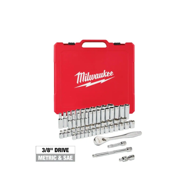 Milwaukee 48-22-9008 3/8 in. Drive SAE/Metric Ratchet and Socket Mechanics Tool Set (56-Piece)Designed from the ground up, this 56-piece 3/8 in. drive ratchet and socket set offers better access in tight spaces and maximum tool strength. The 90-tooth ratchet tool offers 4 of arc swing and a slim profile design, so you can work in tighter spaces. The innovative, wrench-compatible socket design has 4 parallel flats to help prevent rolling.Optimized socket geometry additionally helps reduce bolt rounding and stripping. Find each socket size stamped into the flats for easy-to-read visibility. This kit includes a removable inner tray and is designed to be stored long-term in a steel storage chest. It also comes with a durable carrying case for ultimate portability. The sets accessories make sure the user can get every job done, both in the garage and on the jobsite. The ratchet and socket set is backed by a Mechanics Hand Tools Lifetime Guarantee.90-tooth design4 of arc swingSlim profile ratchetFlush directional leverSocket flats deter rollingWrench-ready socket designStamped socket sizesRemovable inner storage trayPortable carrying caseLifetime guaranteeIncludes: standard sockets: 1/4 in., 5/16 in., 3/8 in., 7/16 in., 1/2 in., 9/16 in., 5/8 in., 11/16 in., 3/4 in., 13/16 in., 7/8 in., 15/16 in., 1 in., 6 mm, 7 mm, 8 mm, 9 mm, 10 mm, 11 mm, 12 mm, 13 mm, 14 mm, 15 mm, 16 mm, 17 mm, 18 mm, 19 mm deep well sockets: 1/4 in., 5/16 in., 3/8 in., 7/16 in., 1/2 in., 9/16 in., 5/8 in., 11/16 in., 3/4 in., 13/16 in., 7/8 in., 6 mm, 7 mm, 8 mm, 9 mm, 10 mm, 11 mm, 12 mm, 13 mm, 14 mm, 15 mm, 16 mm, 17 mm, 18 mm, 19 mm accessories: 3 in. extension, 6 in. extension, universal swivel 90-tooth ratchetAdditional ResourcesFrom the ManufacturerWarranty