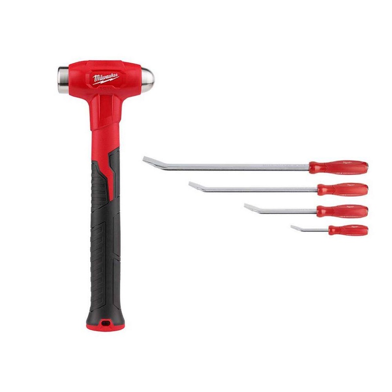 Milwaukee 48-22-9140-48-22-9214 16 oz. Dead Blow Ball Peen Hammer with Pry Bar SetThe Milwaukee 16 oz. Dead Blow Ball Peen Hammer delivers up to 10x vibration reduction for users. The steel ball peens SHOCKSHIELD Grip reduces vibration up to 10x more than the competition. The hammers precision balanced design offers more control when swinging to strike objects.The Milwaukee Pry Bar Set features an I-Beam Design for up to 40% More Prying Strength. The All-Metal Core and Hammer-Ready Strike Cap increase leverage and durability. Each pry bar has a Comfort Tri-Lobe Handle, as well as a Chrome Finish for superior corrosion resistance. The 4pc Pry Bar Set comes in an Easy-Access Tray for a long-term storage solution.Most durable: steel reinforced handlePrecision balanced designAnti-slip grip: overmold handle for more controlMost durable grip resistant to peeling when exposed to solventsSmooth face for striking chisels and punchesBall peen for shaping metal16 oz. head weight13 in. handle lengthLifetime guaranteeIncludes: (1) 16 oz. dead blow ball peen hammer, (1) 8 in. pry bar, (1) 12 in. pry bar, (1) 18 in. pry bar, (1) 24 in. barI-beam design: up to 40% strongerAll-metal coreHammer-ready strike capComfortable tri-lobe handlesChrome finish for corrosion resistanceEasy-access storage trayDimensionsAssembled Depth (in.)12.25 inAssembled Height (in.)1.8125 inAssembled Width (in.)4.4375 inHandle Length (in.)10.0 inWeight of Head (oz.)16