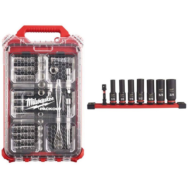 Milwaukee 48-22-9482-49-66-7024 3/8 in. Drive Metric Ratchet and Socket Mechanics Tool Set with PACKOUT Case & Impact Socket Set (40-Piece)This Milwaukee Combo Kit features a 90-tooth ratchet tool that provides 4 degree of arc swing and a slim profile for work in tighter spaces. The included ratchet and socket set has FOUR FLAT Sides that prevent rolling and are wrench compatible. Sizes are stamped into each socket for easy-to-read visibility. Users can keep this 32-piece. Drive Ratchet and Socket Set organized in the included PACKOUT Compact Low-Profile Organizer with a clear top for easy identification of parts at a glance. This Milwaukee Combo Kit includes a 32-Piece 3/8 in. Metric Drive Ratchet and Socket Set and a PACKOUT Compact Low-Profile Organizer. The MILWAUKEE 8-Piece SHOCKWAVE Impact Duty 3/8 in. Drive SAE Deep 6 Point Socket Set features the boldest, longest-lasting markings and extreme impact durability in high torque applications. The stamped and ink-filled size marking enables users to select the right socket every time throughout the life of the socket. These Milwaukee sockets are engineered with high strength forged steel for optimized performance in heavy-duty applications. The non-slip hex geometry prevents fastener rounding, and a dual-hole design and ring groove allow for easy socket attachment and removal. The customizable Socket Rail comes with removeable end caps to add or take off socket clips for optimal storage. All SHOCKWAVE Impact Duty Sockets backed by a Lifetime Guarantee and meet ASME industry standards.48-22-9482: Ratchet has 90 tooth design with 4 degree arc swing for tight work spaces48-22-9482: Ratchet and socket set with slim profile ratchet48-22-9482: Ratchet has a flush directional lever48-22-9482: Sockets with 4-flat sides to deter rolling48-22-9482: Wrench-ready sockets with 4-flat sides48-22-9482: Sockets with stamped sizesPackout organizer has an impact resistant bodyPackout organizer has a ip65 rated protectionPackout organizer has clear top for easy identification of contentsPackout organizer has heavy-duty latchesPackout organizer has reinforced hinge48-22-9482 Included: 32-piece 3/8 in. drive metric ratchet and socket set (48-22-9508). Sockets: 10 mm Deep, 10 mm, 11 mm Deep, 11 mm, 12 mm Deep, 12 mm, 13 mm Deep, 13 mm, 14 mm Deep 14 mm 15 mm Deep, 15 mm, 16 mm Deep, 16 mm, S17 mm Deep, 17 mm, 18 mm Deep, 18 mm, 19 mm Deep, 19 mm, 6 mm Deep well socket, 6 mm, 7 mm Deep, 7 mm, 8 mm Deep, 8 mm, 9 mm Deep, 9 mm, universal hose adapter, 3 in. extension, 6 in. extension, 90-Tooth 3/8 in. Drive Ratchet, PACKOUT compact organizer (48-22-8436)49-66-7024: Non-slip hex geometry to prevent socket and fastener rounding49-66-7024: Lifetime Guarantee covers impact sockets and extensions only49-66-7024: Laser etched part number49-66-7024: Optimized for use with 3/8 drive impact wrenches, drivers, ratchets, and adapters49-66-7024: Dual hole design and groove for easier attachment49-66-7024 Includes: 5/16, 3/8, 7/16, 1/2, 9/16, 5/8, 3/4, 3/8 Socket AdapterDimensionsDrive Size3/8 in