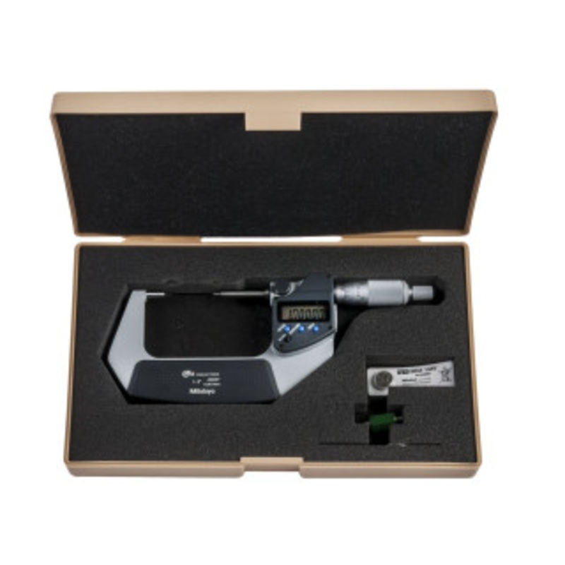 A waterproof digital Mitutoyo micrometer suitable for use in the presence of coolant or cutting oil. Spindle and anvil are reduced in diameter to enable measurement within slotted features, such as keyways. The highly stable frame incorporates a heat shield to preserve accuracy over extended measuring sessions. A ratchet stop guarantees repeatable measurement. Digimatic data output.
