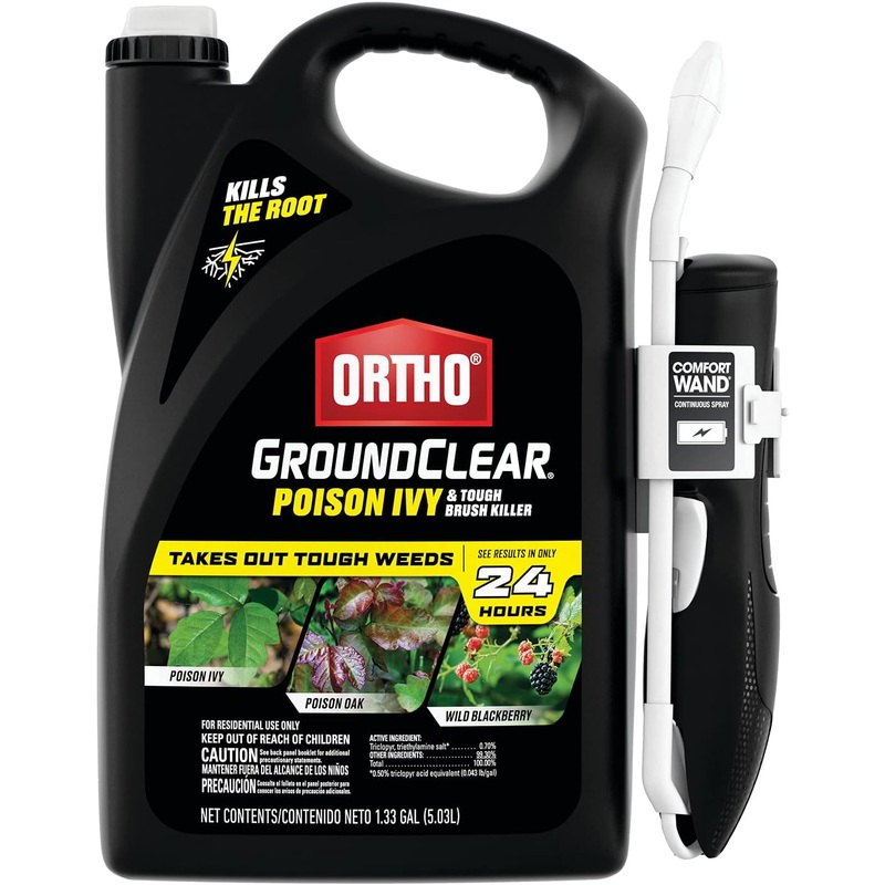 Ortho GroundClear Poison Ivy & Tough Brush Killer Ready to Use with Comfort Wand, Poison Ivy Killer, Also Kills Poison Oak, Kudzu, Wild Blackberry, Vines & More, 1.33 gal.Ortho GroundClear Poison Ivy & Tough Brush Killer kills over 60 types of tough weeds including poison oak, wild blackberry, kudzu, and other woody plants, vines, and brambles, right down to the roots. Its a fast-acting spray that can produce yellowing and wilting in 24 hours and is rainproof in just two hours. To use, first install the Ortho Comfort Wand from the side of the bottle to easily reach and target weeds with a continuous streamno bending or pumping required. To achieve the best results, apply when the air is calm and weeds are leafed-out and actively growing. Spray the vine killer thoroughly to wet the foliage, stems, and trunks. Its ideal for use in non-garden areas like around homes, cabins, buildings, fences, and along trails. If you have a particularly hard-to-kill weed you may need to treat it a second time to completely be rid of it.Enjoy your yard more with Ortho GroundClear Poison Ivy & Tough Brush Killer; kills over 60 types of weeds, including poison ivy, kudzu, poison oak, wild blackberry, and other tough weeds like carpetweed and white cloverto the rootsFAST ACTING: Youll start to see leaves turn yellow and wilt in just 24 hoursRAINPROOF: The herbicide is rainproof two hours after applicationTREAT NON-GARDEN AREAS: Apply directly on weeds and brush in areas around homes, cabins, buildings, fences, and along trailsEASY TO USE: To use, install the Ortho Comfort Wand from the side of the bottle to target weeds with a continuous streamno bending or pumping required; apply when weeds are actively growingProduct informationProduct Dimensions5.5 x 9.5 x 12 inchesItem Weight12.34 poundsManufacturerThe Scotts Company LLCItem model number475705