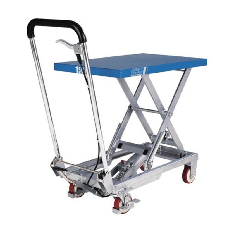 Work platform with adjustable height. Hydraulic foot pump lifts the table with minimal effort. Lockable wheel feature for added safety. Table size 850 x 500mm. Table height 285-850mm.