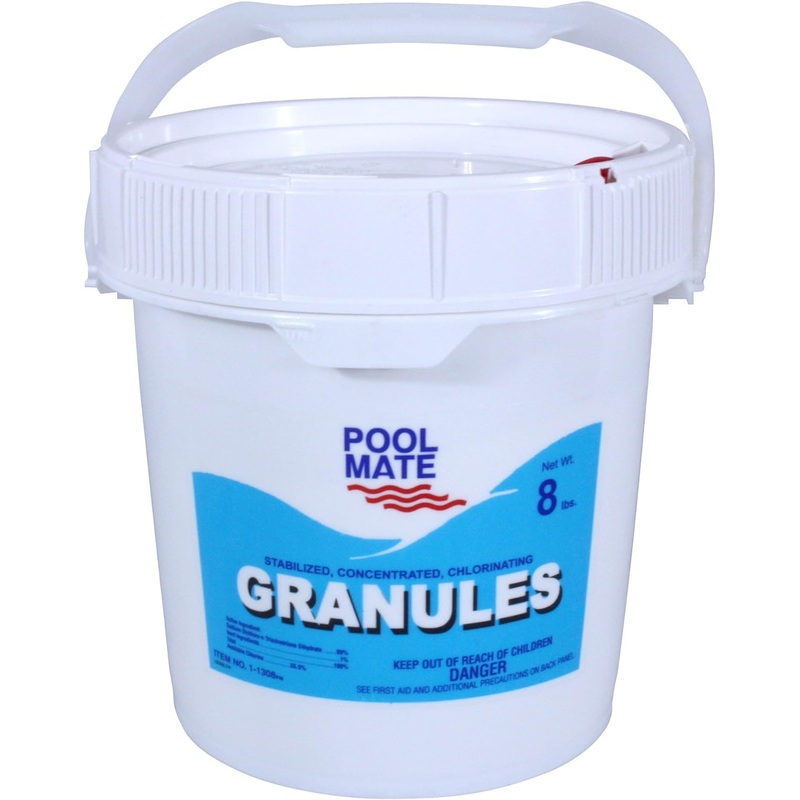 Pool Mate 1-1308 Pool Chlorine Granules, 8-PoundsBroadcast the product evenly over a wide area in the deepest part of the pool with water circulating.Throughout the pool season, adjust pH to 7.2-7.6 with a pH increaser or pH decreaser. Broadcast 3 oz. of this product per 10,000 gallons pool water every other day or as often as needed to maintain chlorine residual at 2-4 ppm. This quantity may vary depending on bather load, temperature and other conditions. Re-entry into treated pools is prohibited above levels of 3 pm chlorine. As a preventative treatment, you should shock treat weekly to prevent pool problems which may occur when bathing loads are high, water appears hazy or dull, unpleasant odors or eye imitation occur, after heavy wind and rain storms, when temperatures are high, in case of colored water, or if algae develops with resulting green color and slimy feeling.Broadcast 3 ounces of this product per 10,000 gallons pool water every other day or as often as needed to maintain chlorine residual at 2-4 ppmStabilized, concentrated chlorinating granulesCustomers prefer chlorinating granules because it has little to no effect on pH levelsCan be used as a routine chlorine sanitizer or as a shock treatmentPowerful, super-concentrated, residue-free, and fast-dissolvingProduct informationProduct Dimensions9 x 9 x 9 inchesItem Weight8 poundsManufacturerRobelle IndustriesCountry of OriginUSAItem model number1-1308